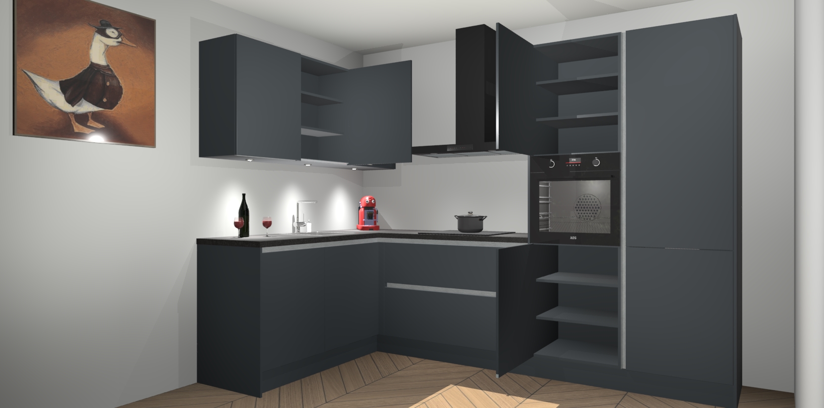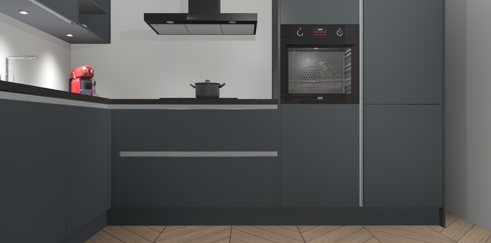 De Onyxgrijze greeploze keuken Cognac is een adembenemend ontwerp met een modern en tijdloos uiterlijk. Deze luxe keuken straalt echt aristocratisch uit, waardoor uw koken plezieriger zal worden! Het prachtige design begint bij de hoekkeuken, wat perfect past bij elk type interieur. Bovendien bevat deze hoogwaardige set vijf inbouwapparaten - van oven tot koelkast - die via bestelling naar AEG geüpgraded kunnen worden!