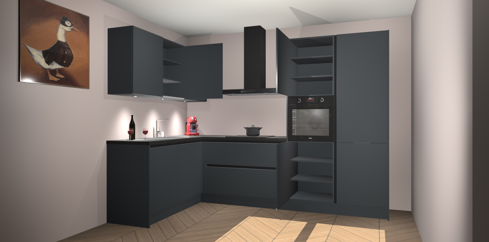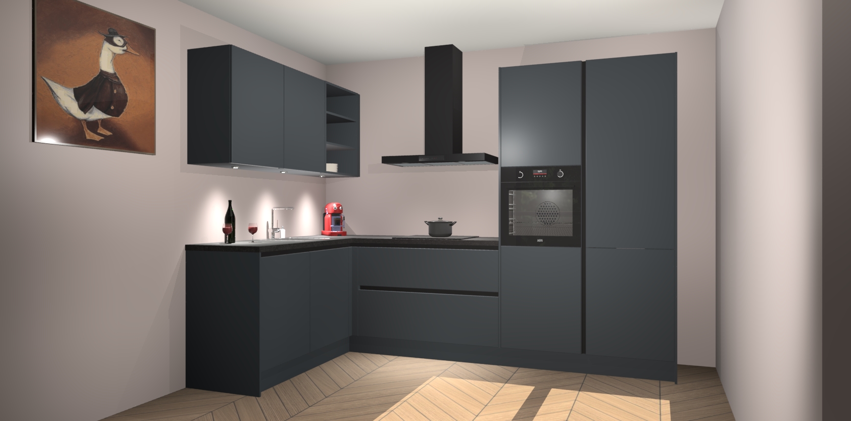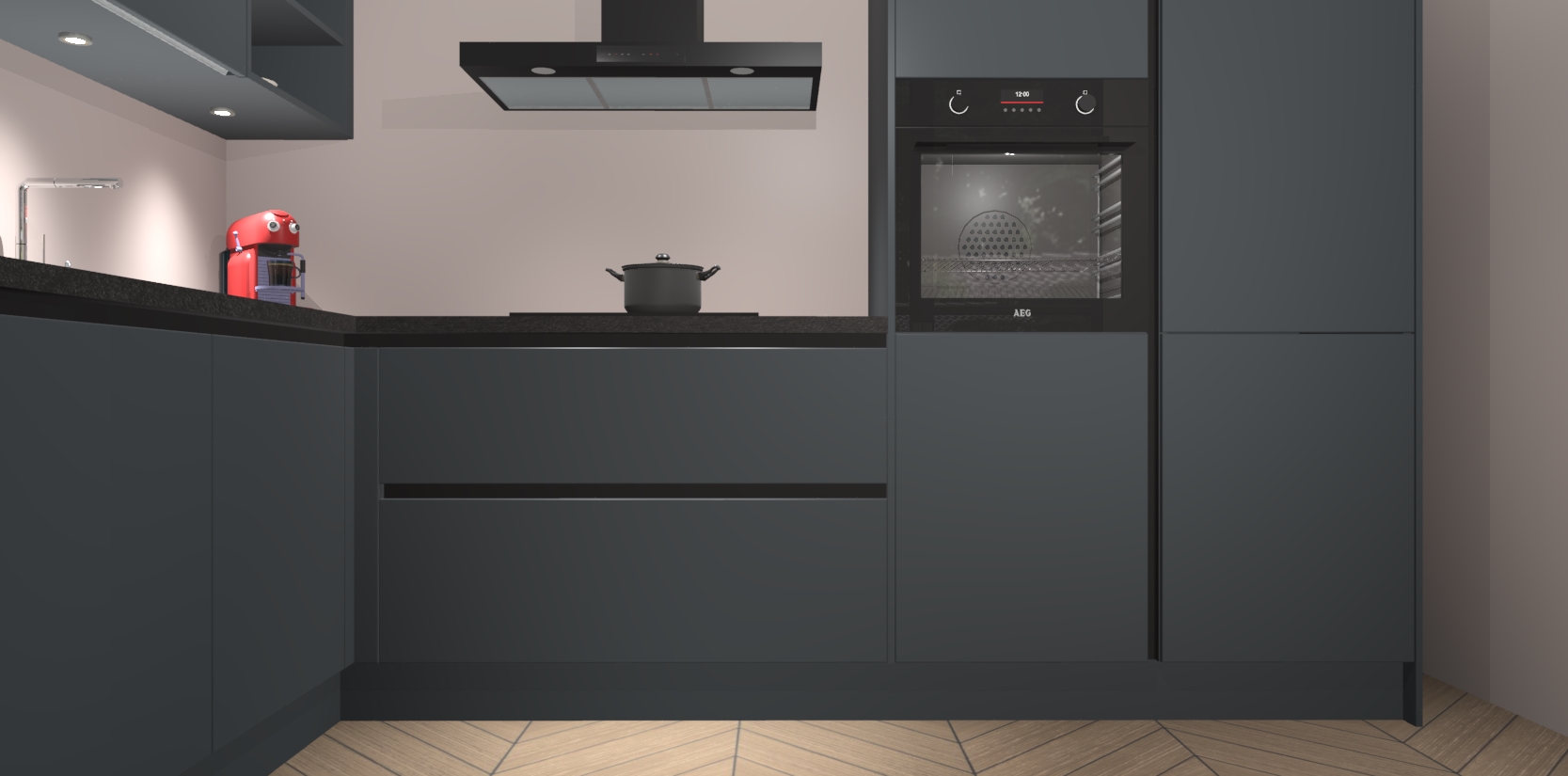 De Onyxgrijze greeploze keuken Cognac is een adembenemend ontwerp met een modern en tijdloos uiterlijk. Deze luxe keuken straalt echt aristocratisch uit, waardoor uw koken plezieriger zal worden! Het prachtige design begint bij de hoekkeuken, wat perfect past bij elk type interieur. Bovendien bevat deze hoogwaardige set vijf inbouwapparaten - van oven tot koelkast - die via bestelling naar AEG geüpgraded kunnen worden!