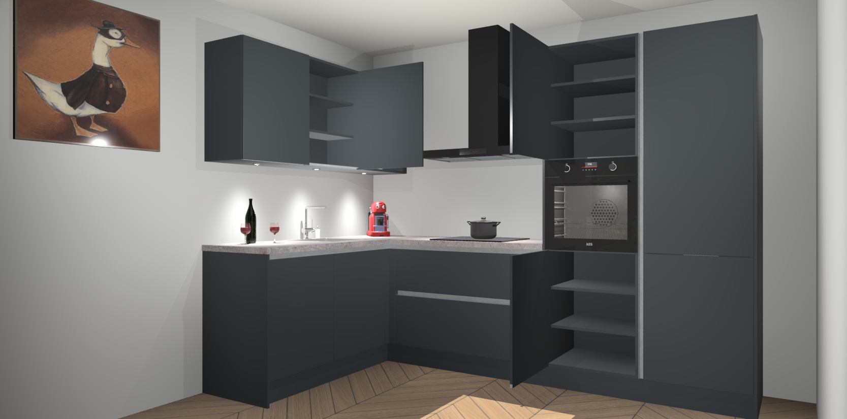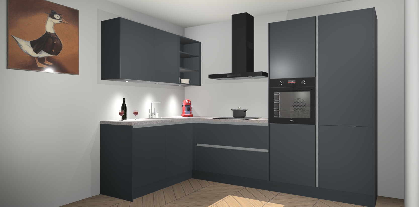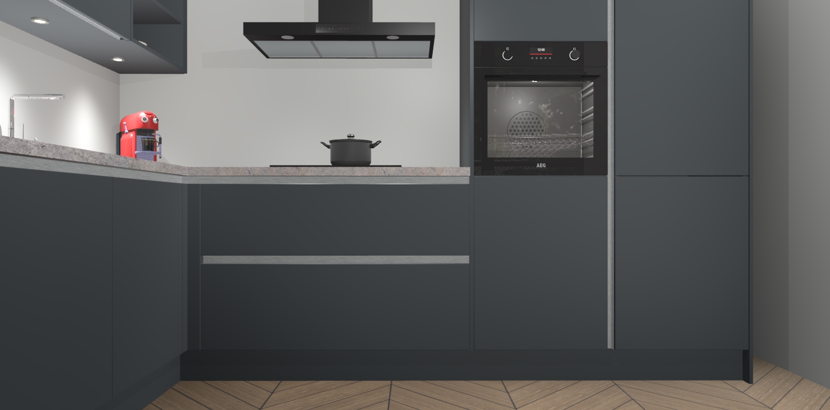 De Onyxgrijze greeploze keuken Cognac is een adembenemend ontwerp met een modern en tijdloos uiterlijk. Deze luxe keuken straalt echt aristocratisch uit, waardoor uw koken plezieriger zal worden! Het prachtige design begint bij de hoekkeuken, wat perfect past bij elk type interieur. Bovendien bevat deze hoogwaardige set vijf inbouwapparaten - van oven tot koelkast - die via bestelling naar AEG geüpgraded kunnen worden!