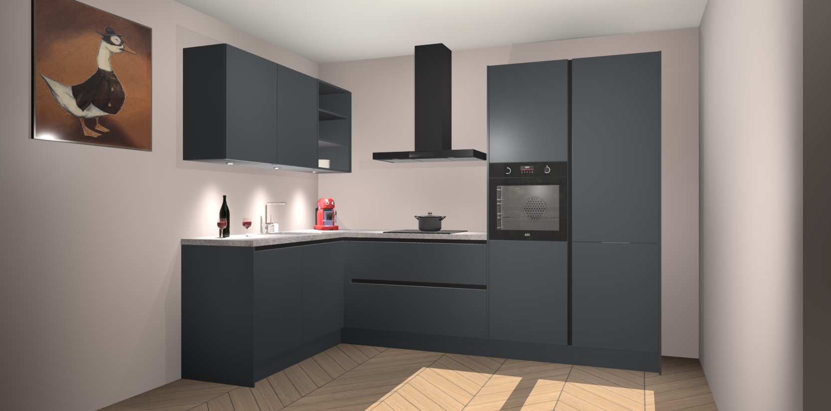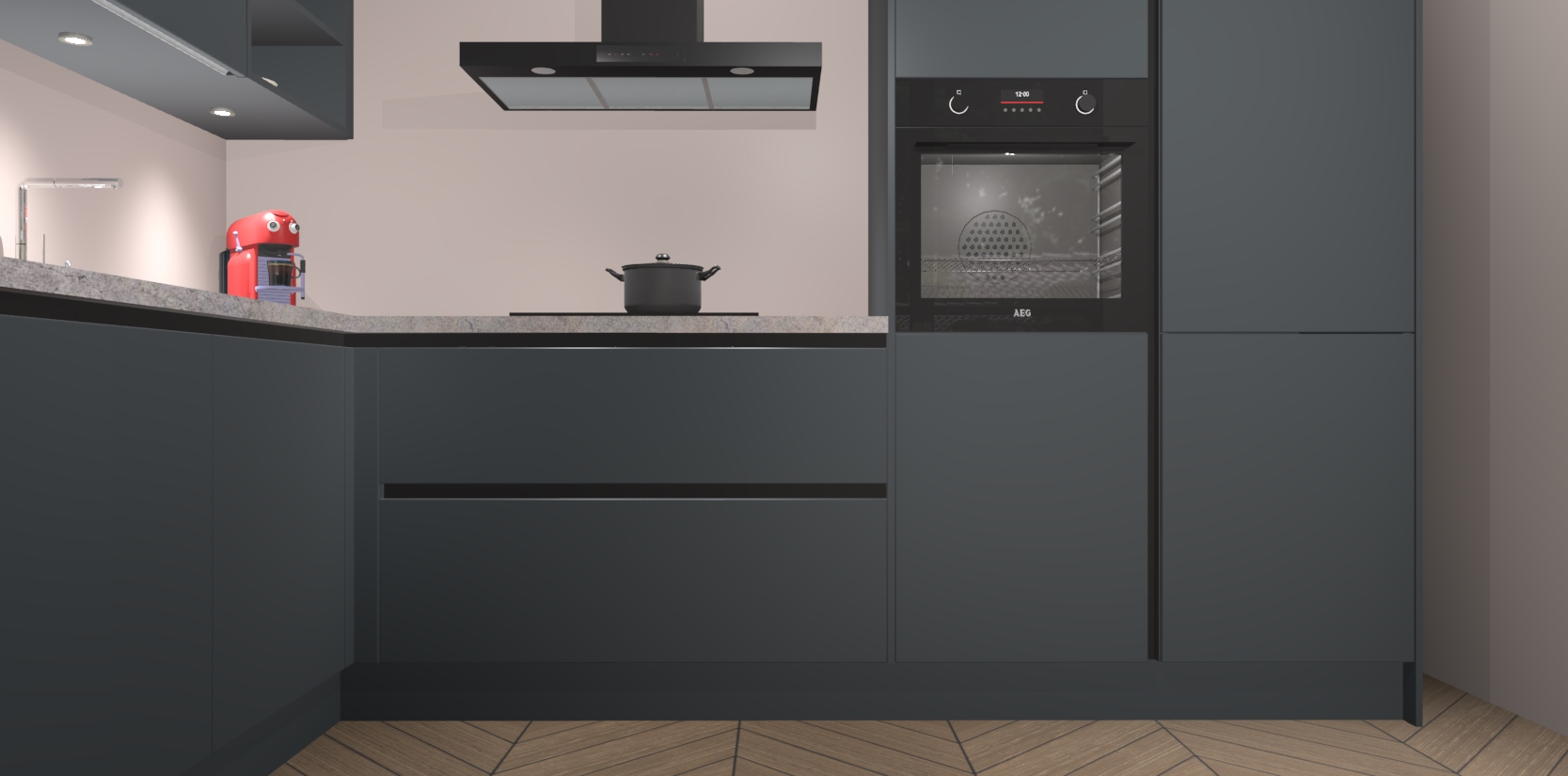 De Onyxgrijze greeploze keuken Cognac is een adembenemend ontwerp met een modern en tijdloos uiterlijk. Deze luxe keuken straalt echt aristocratisch uit, waardoor uw koken plezieriger zal worden! Het prachtige design begint bij de hoekkeuken, wat perfect past bij elk type interieur. Bovendien bevat deze hoogwaardige set vijf inbouwapparaten - van oven tot koelkast - die via bestelling naar AEG geüpgraded kunnen worden!
