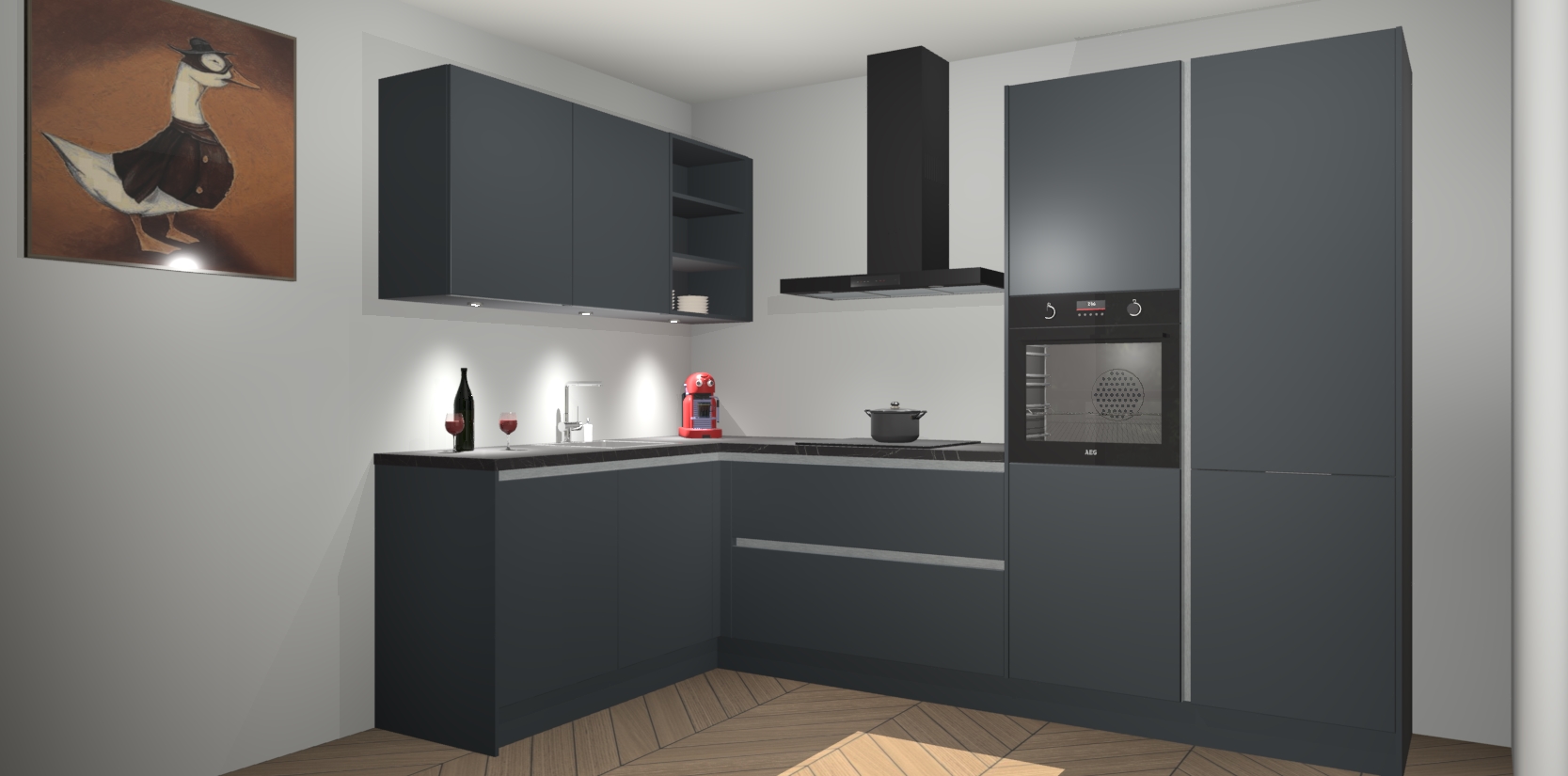 De Onyxgrijze greeploze keuken Cognac is een adembenemend ontwerp met een modern en tijdloos uiterlijk. Deze luxe keuken straalt echt aristocratisch uit, waardoor uw koken plezieriger zal worden! Het prachtige design begint bij de hoekkeuken, wat perfect past bij elk type interieur. Bovendien bevat deze hoogwaardige set vijf inbouwapparaten - van oven tot koelkast - die via bestelling naar AEG geüpgraded kunnen worden!