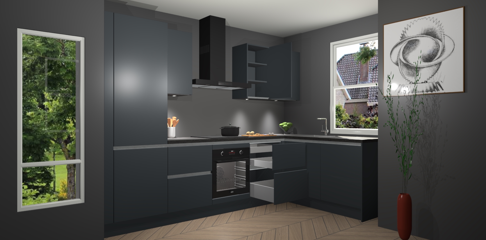 De onyxgrijze greeploze keuken Geneve is uitgerust met 5 inbouwapparaten - een oven, inductiekookplaat, afzuigkap, vaatwasser en koelkast - voor al uw kook- en bewaarbehoeftes. U kunt deze apparaten desgewenst eenvoudig upgraden naar AEG of de oven omruilen voor een combimagnetron na het plaatsen van uw bestelling. En met de soft close deuren, voldoende opbergruimte en kasten die voorgemonteerd worden geleverd, bent u in een mum van tijd klaar om heerlijke maaltijden te bereiden!