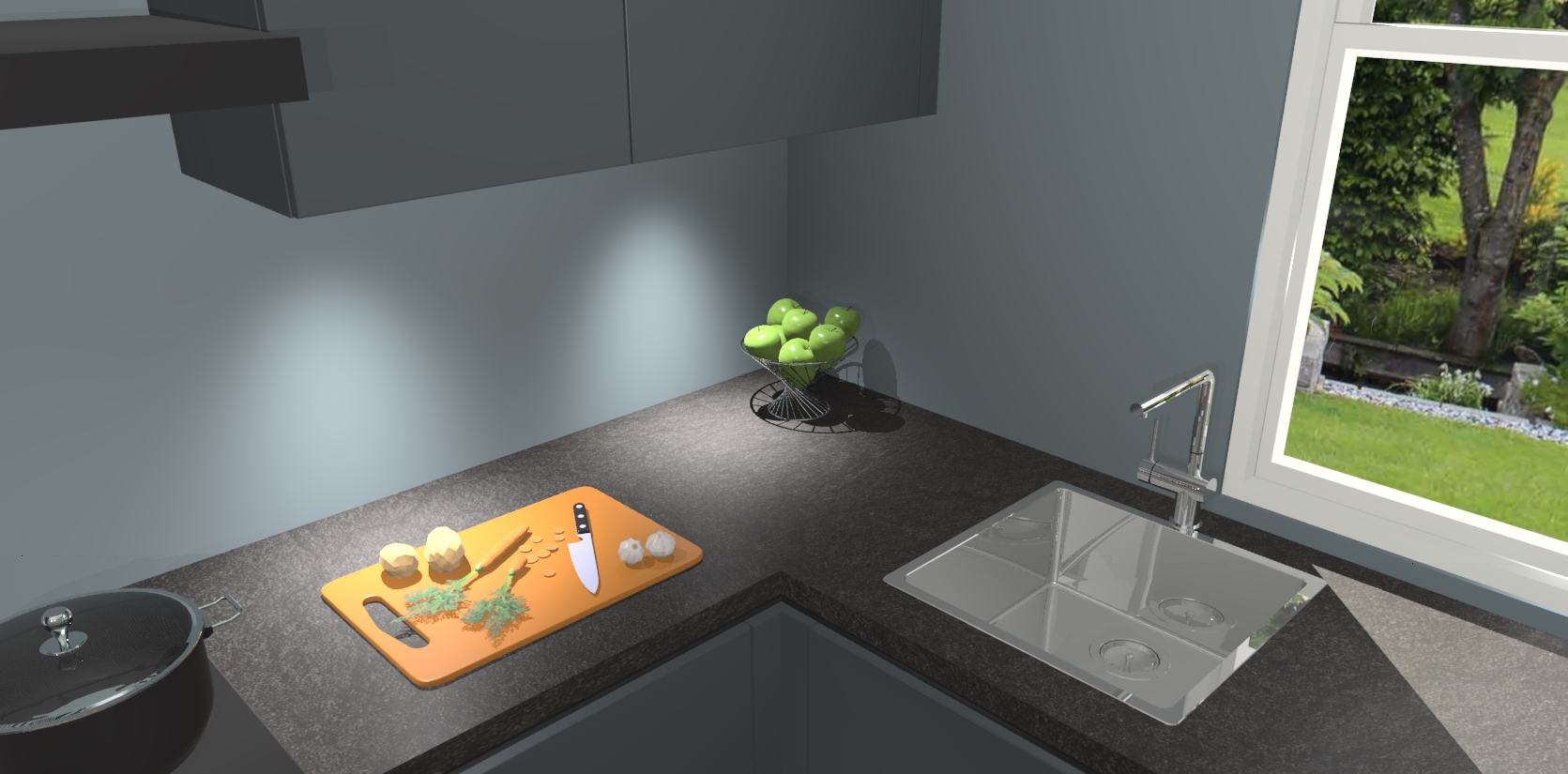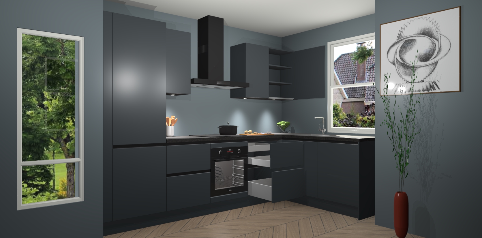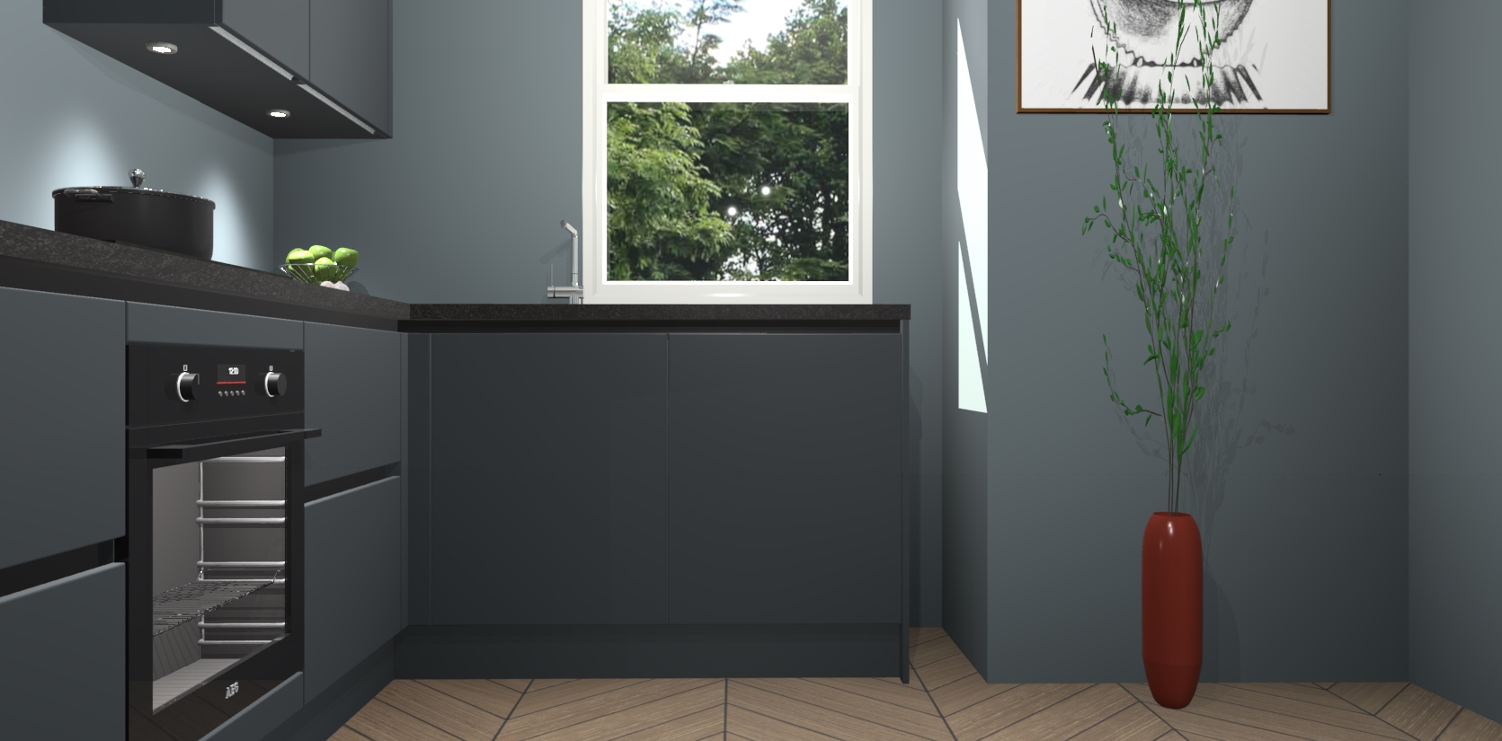 De onyxgrijze greeploze keuken Geneve is uitgerust met 5 inbouwapparaten - een oven, inductiekookplaat, afzuigkap, vaatwasser en koelkast - voor al uw kook- en bewaarbehoeftes. U kunt deze apparaten desgewenst eenvoudig upgraden naar AEG of de oven omruilen voor een combimagnetron na het plaatsen van uw bestelling. En met de soft close deuren, voldoende opbergruimte en kasten die voorgemonteerd worden geleverd, bent u in een mum van tijd klaar om heerlijke maaltijden te bereiden!