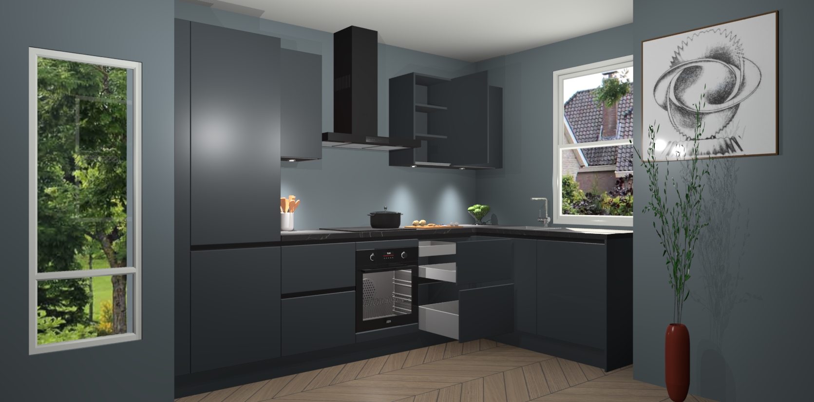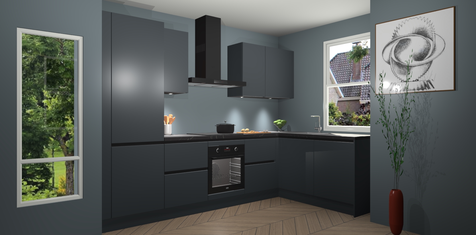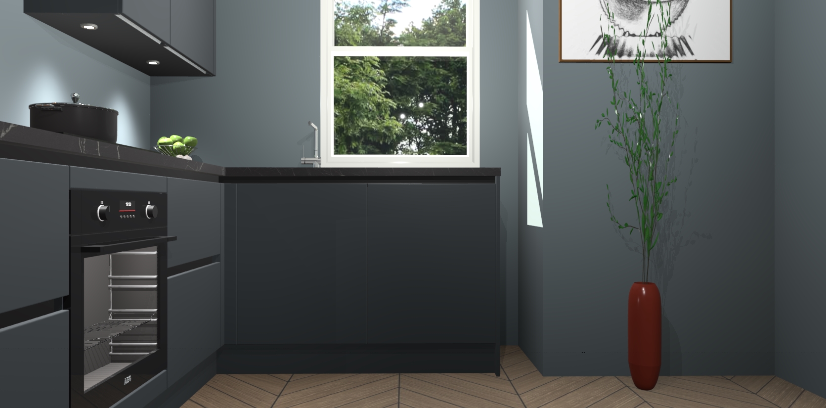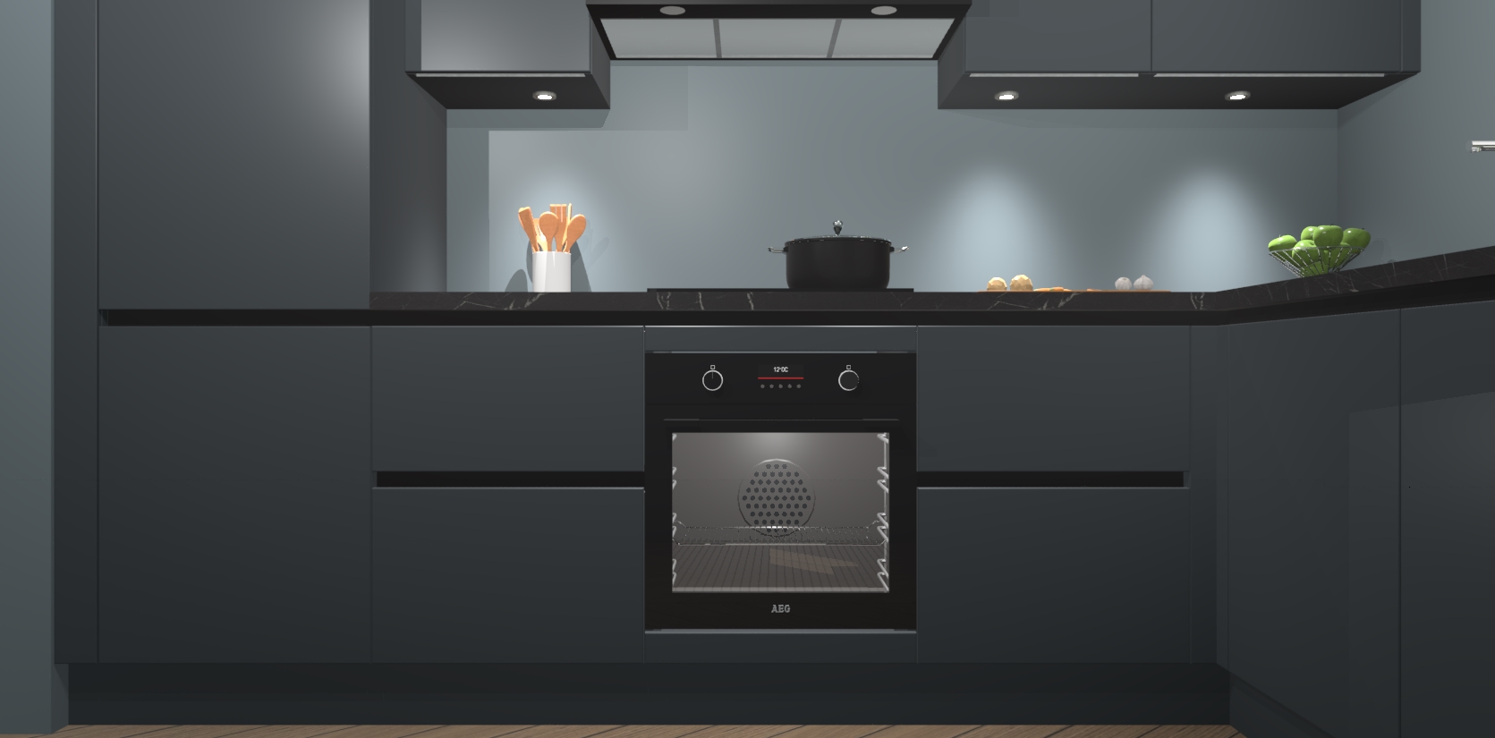 De onyxgrijze greeploze keuken Geneve is uitgerust met 5 inbouwapparaten - een oven, inductiekookplaat, afzuigkap, vaatwasser en koelkast - voor al uw kook- en bewaarbehoeftes. U kunt deze apparaten desgewenst eenvoudig upgraden naar AEG of de oven omruilen voor een combimagnetron na het plaatsen van uw bestelling. En met de soft close deuren, voldoende opbergruimte en kasten die voorgemonteerd worden geleverd, bent u in een mum van tijd klaar om heerlijke maaltijden te bereiden!