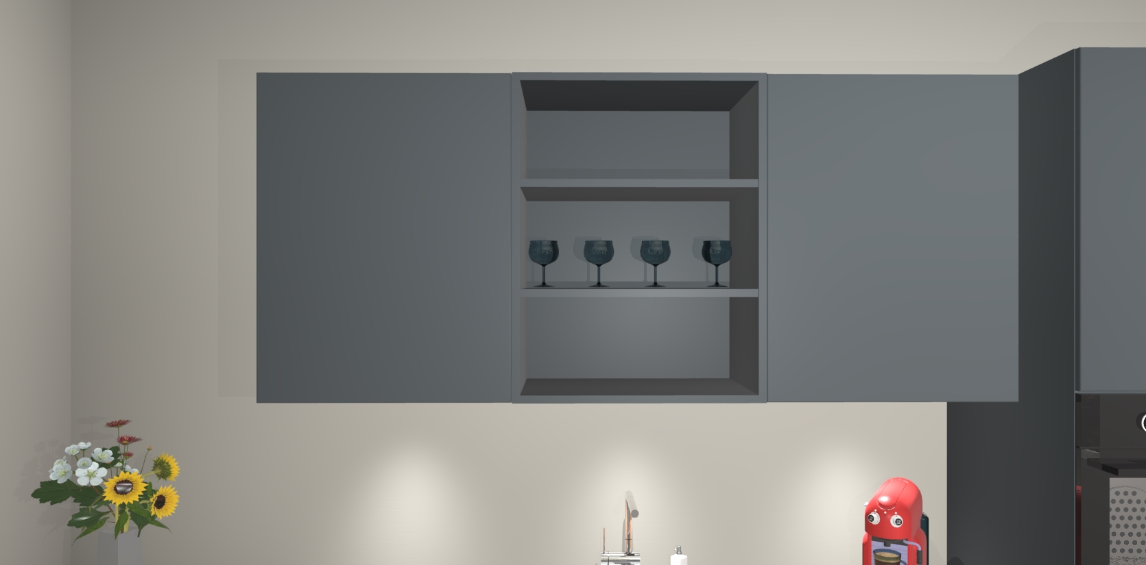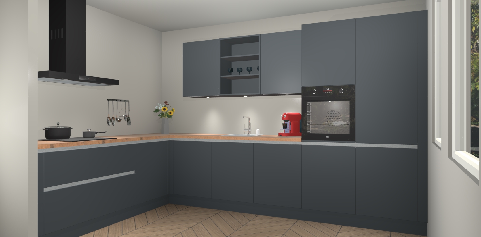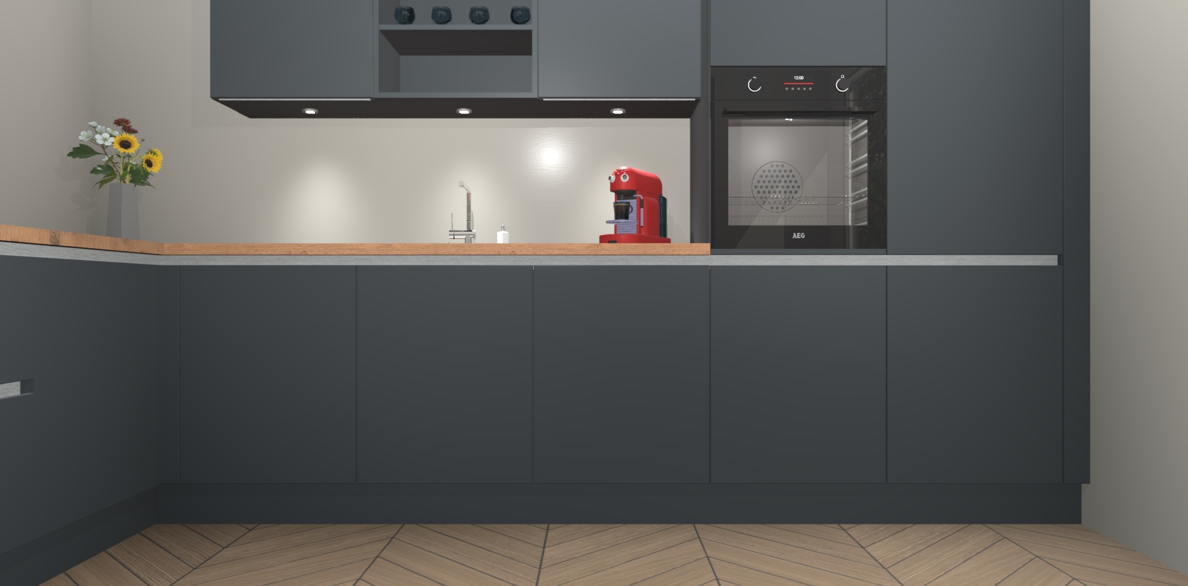 Over opbergruimte hoeft u zich ook geen zorgen te maken! Er is voldoende ruimte voor al uw culinaire behoeftes. Plus, we hebben al 5 inbouwapparaten meegeleverd die gemakkelijk na uw bestelling te upgraden zijn naar AEG: een oven, inductiekookplaat, afzuigkap, vaatwasser en koelkast. En maakt u zich geen zorgen - alle deuren sluiten zacht, dus u hoeft zich geen zorgen te maken over dichtslaande deuren of lawaai terwijl u kookt.