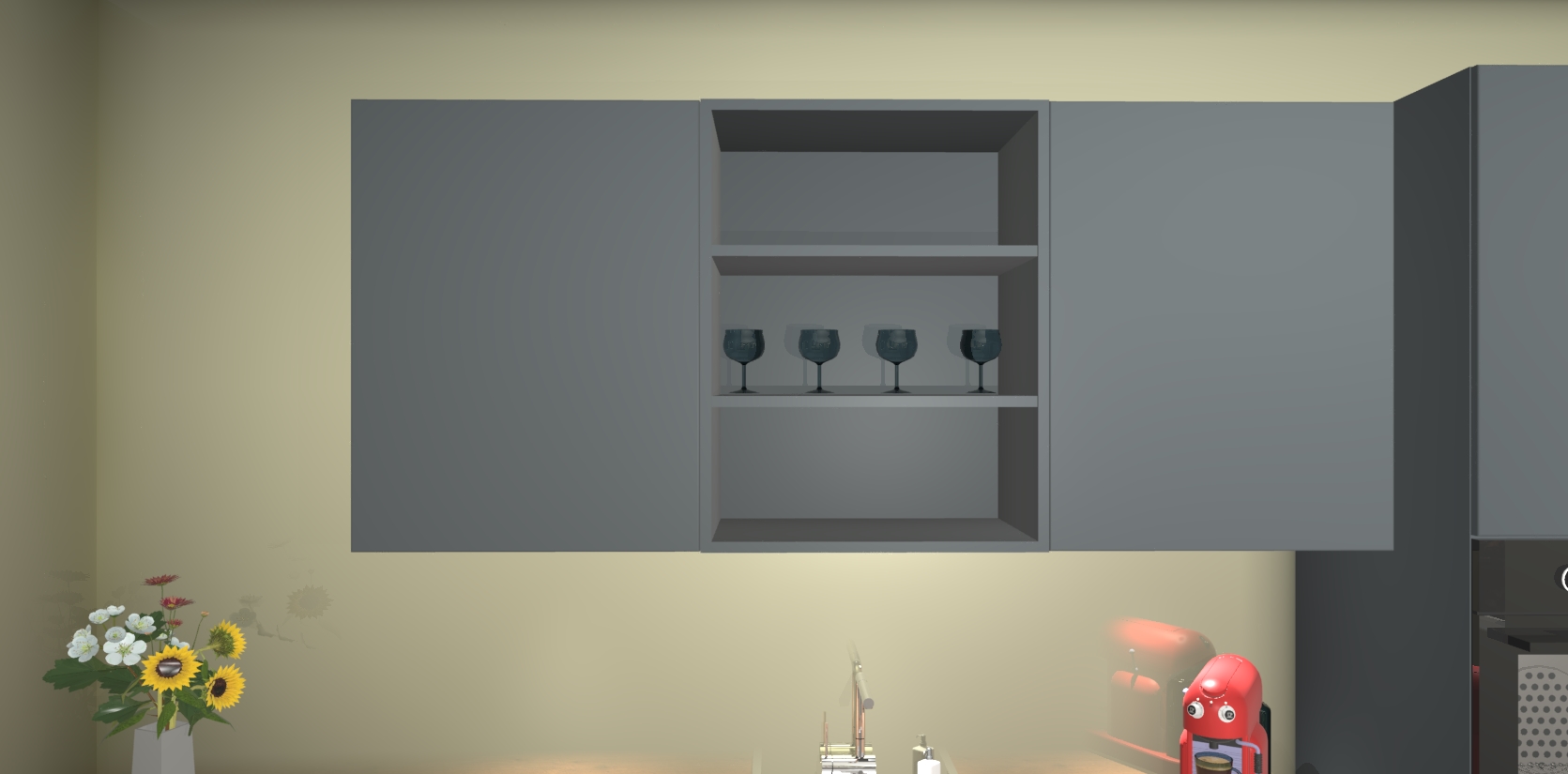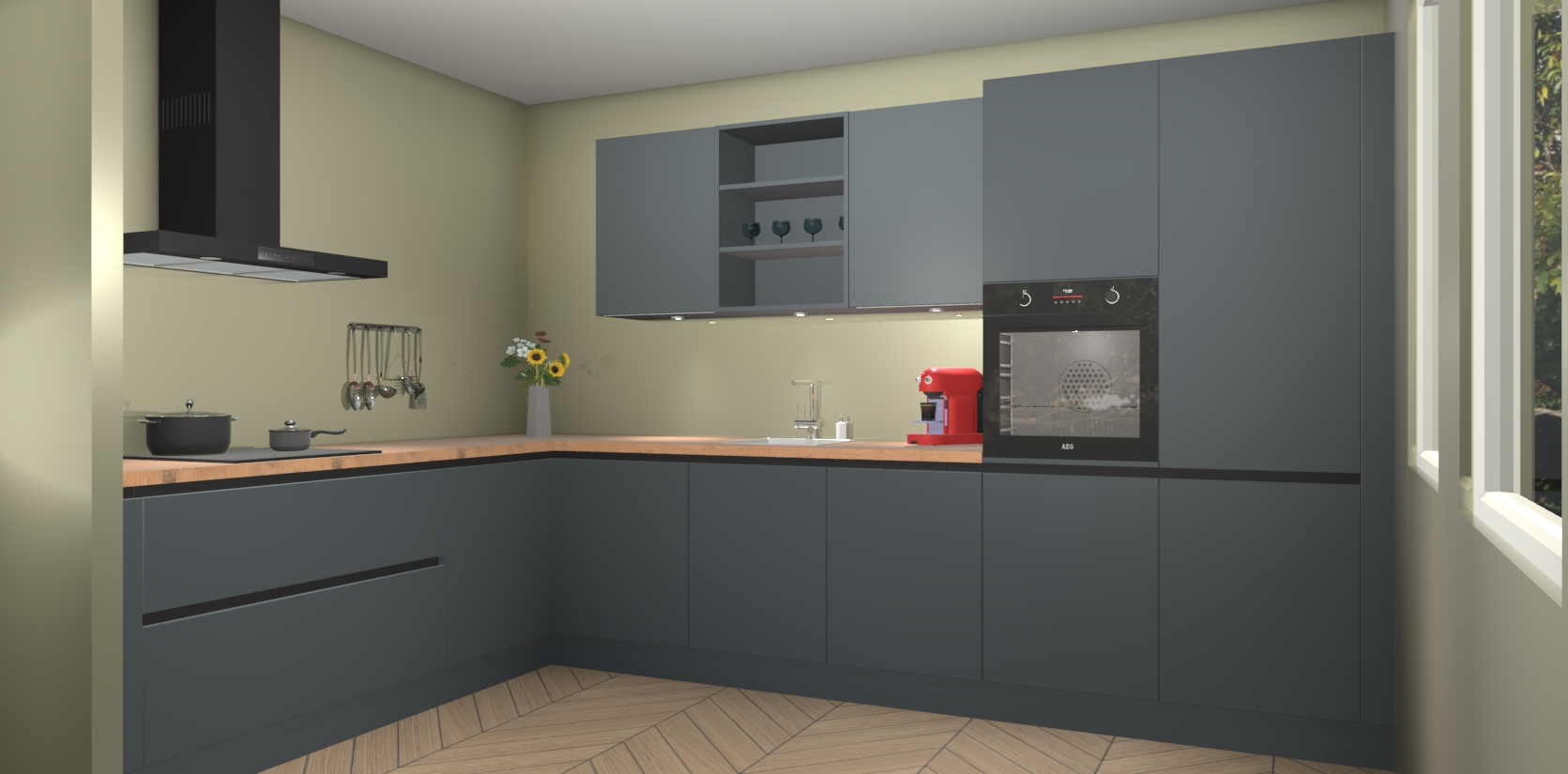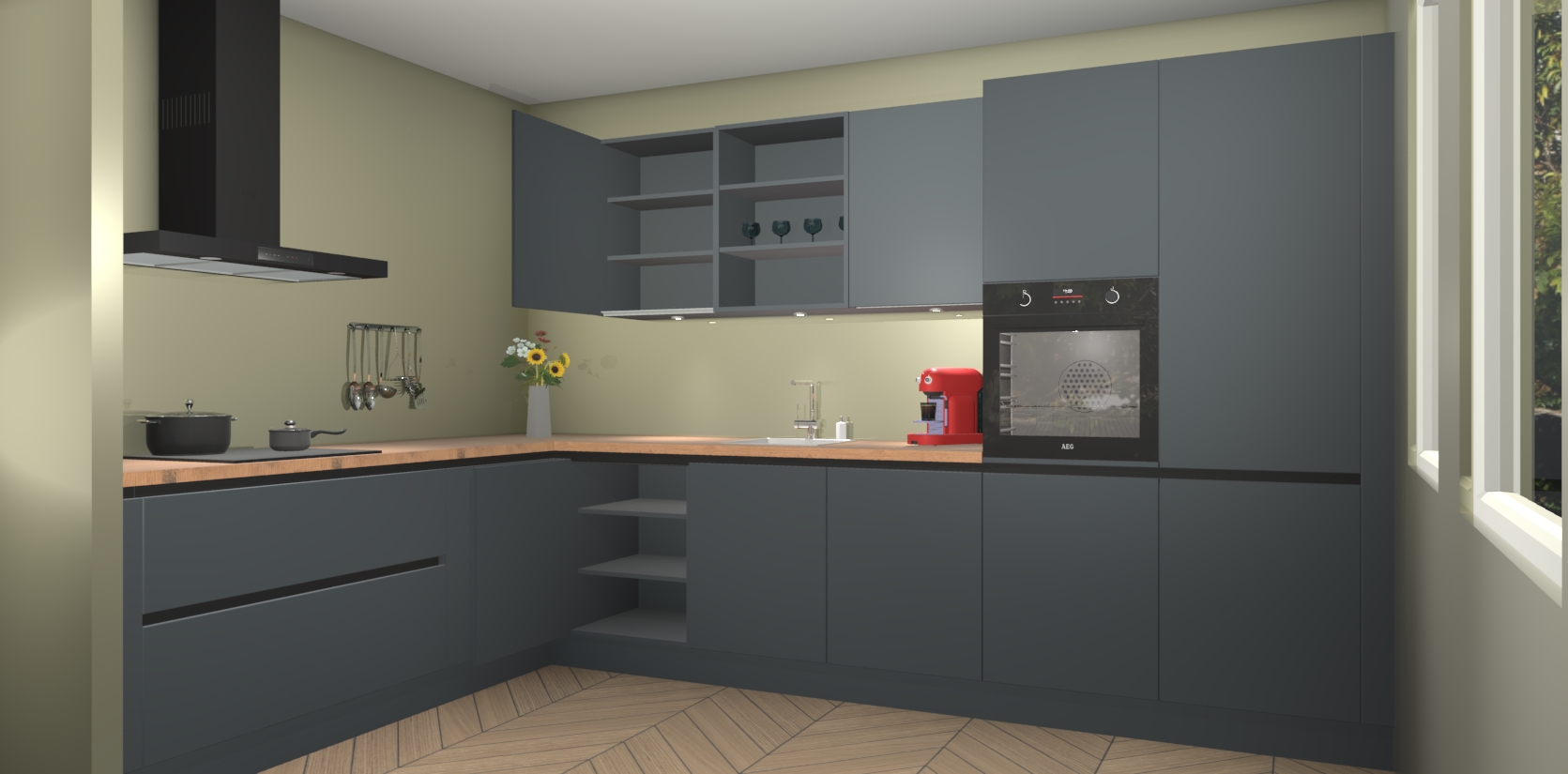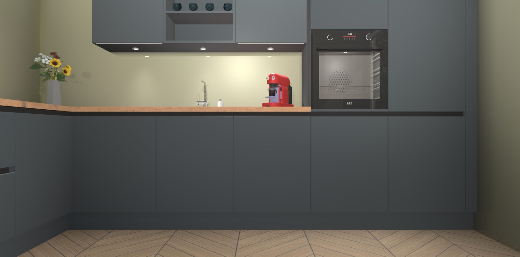 Over opbergruimte hoeft u zich ook geen zorgen te maken! Er is voldoende ruimte voor al uw culinaire behoeftes. Plus, we hebben al 5 inbouwapparaten meegeleverd die gemakkelijk na uw bestelling te upgraden zijn naar AEG: een oven, inductiekookplaat, afzuigkap, vaatwasser en koelkast. En maakt u zich geen zorgen - alle deuren sluiten zacht, dus u hoeft zich geen zorgen te maken over dichtslaande deuren of lawaai terwijl u kookt.