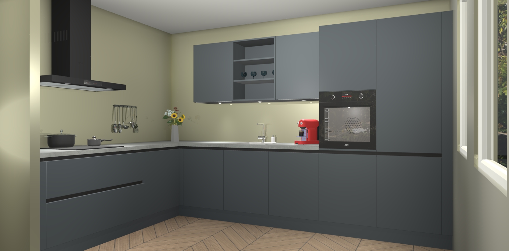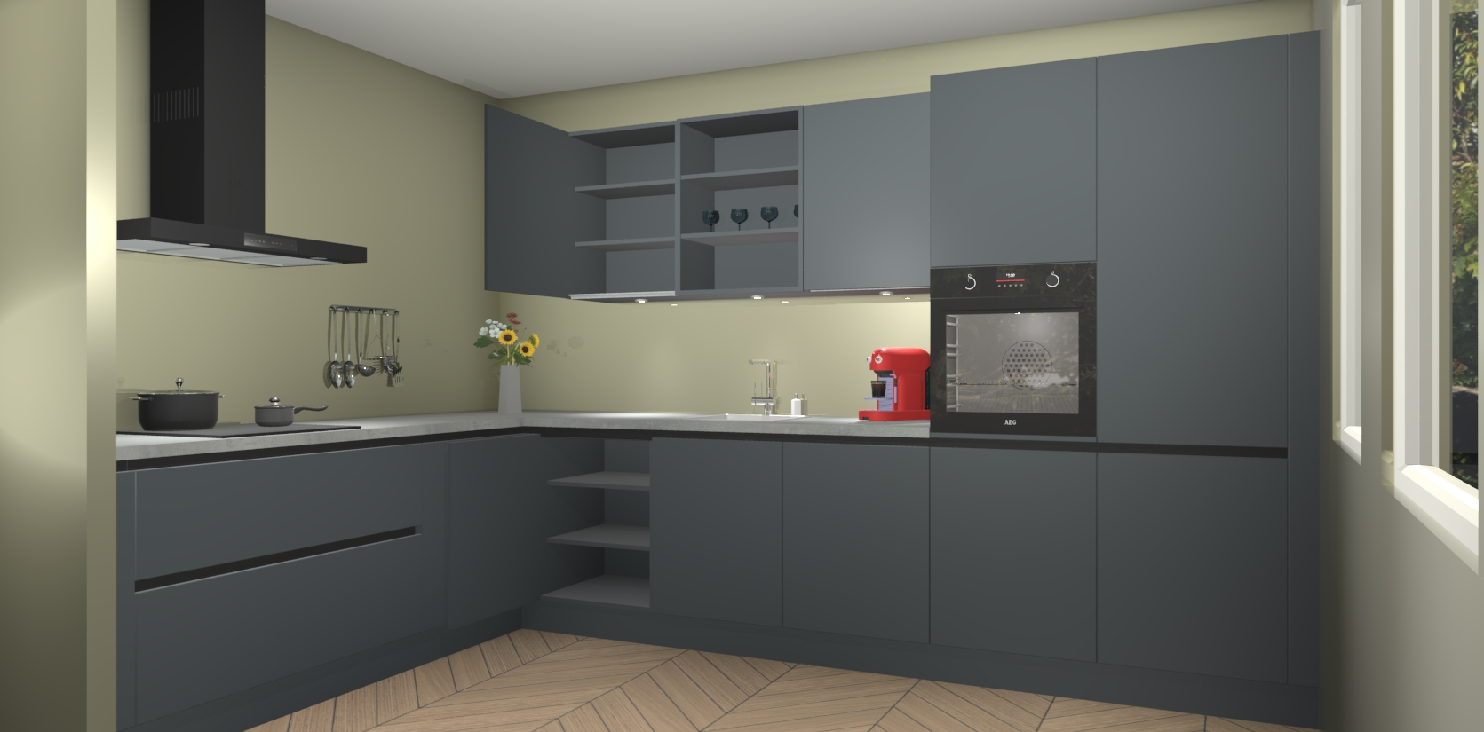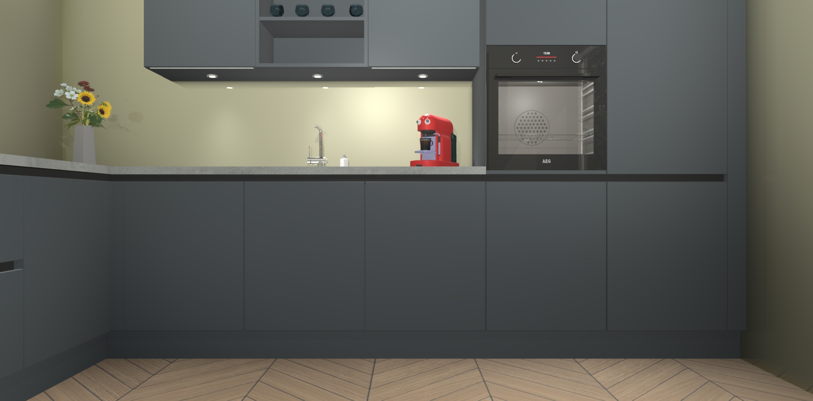 Over opbergruimte hoeft u zich ook geen zorgen te maken! Er is voldoende ruimte voor al uw culinaire behoeftes. Plus, we hebben al 5 inbouwapparaten meegeleverd die gemakkelijk na uw bestelling te upgraden zijn naar AEG: een oven, inductiekookplaat, afzuigkap, vaatwasser en koelkast. En maakt u zich geen zorgen - alle deuren sluiten zacht, dus u hoeft zich geen zorgen te maken over dichtslaande deuren of lawaai terwijl u kookt.
