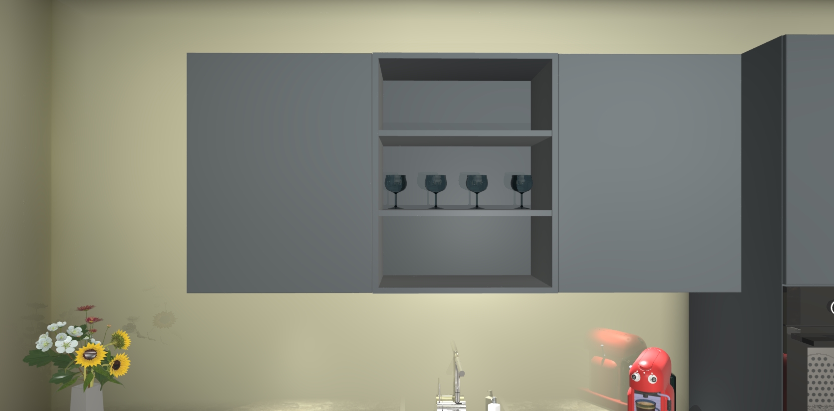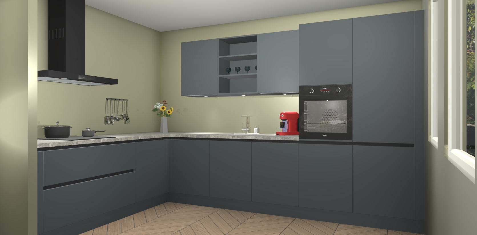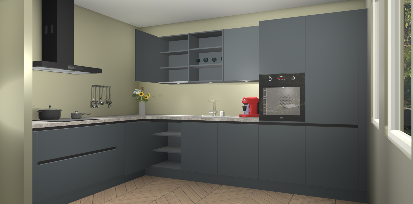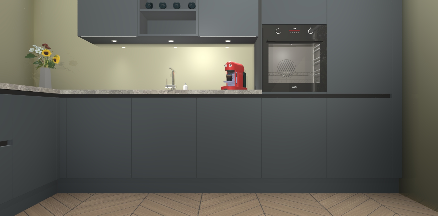 Over opbergruimte hoeft u zich ook geen zorgen te maken! Er is voldoende ruimte voor al uw culinaire behoeftes. Plus, we hebben al 5 inbouwapparaten meegeleverd die gemakkelijk na uw bestelling te upgraden zijn naar AEG: een oven, inductiekookplaat, afzuigkap, vaatwasser en koelkast. En maakt u zich geen zorgen - alle deuren sluiten zacht, dus u hoeft zich geen zorgen te maken over dichtslaande deuren of lawaai terwijl u kookt.