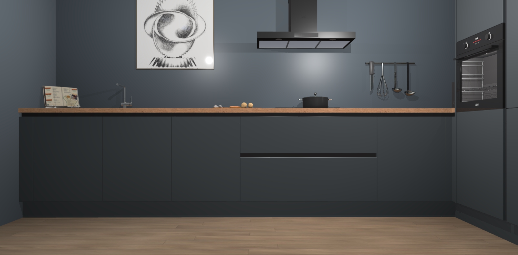 Welkom bij de Onygrijze greeploze keuken Khao Lak. Deze prachtige keuken zal de komende jaren het middelpunt van de belangstelling in uw huis zijn. Uitgerust met vijf inbouwapparaten komt u nooit kookgereedschap tekort. Bovendien geeft de warme houtlook elke ruimte een uitnodigende en tijdloze uitstraling.