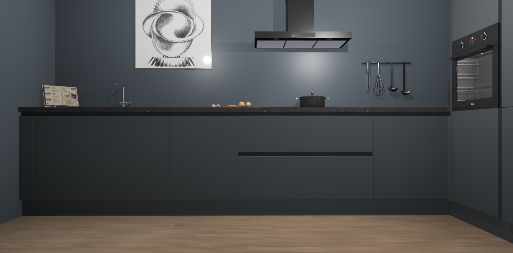 Welkom bij de Onygrijze greeploze keuken Khao Lak. Deze prachtige keuken zal de komende jaren het middelpunt van de belangstelling in uw huis zijn. Uitgerust met vijf inbouwapparaten komt u nooit kookgereedschap tekort. Bovendien geeft de warme houtlook elke ruimte een uitnodigende en tijdloze uitstraling.