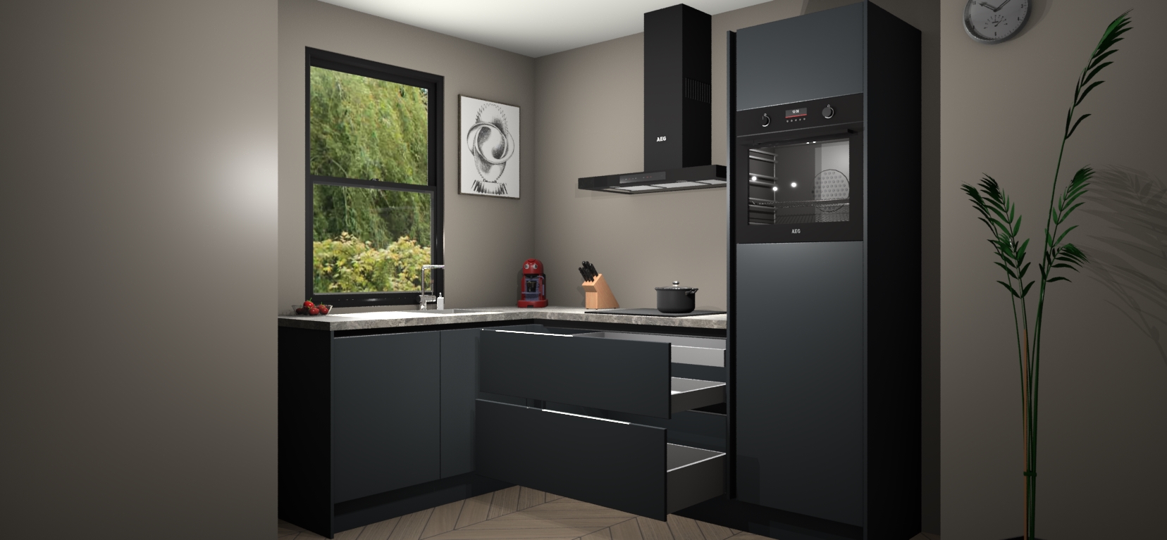 Deze prachtige hoekkeuken heeft alle benodigdheden om uw droomkook- en eetruimte compleet te maken. De Onyxgrijze kasten bieden een echo van raffinement, terwijl de 5 inbouwapparaten genoeg opties bieden voor het bereiden van heerlijke maaltijden. De oven, inductiekookplaat, afzuigkap, vaatwasser en koelkast zorgen ervoor dat u tijd in de keuken zo efficiënt mogelijk verloopt, terwijl ze ook dat extra vleugje luxe bieden.