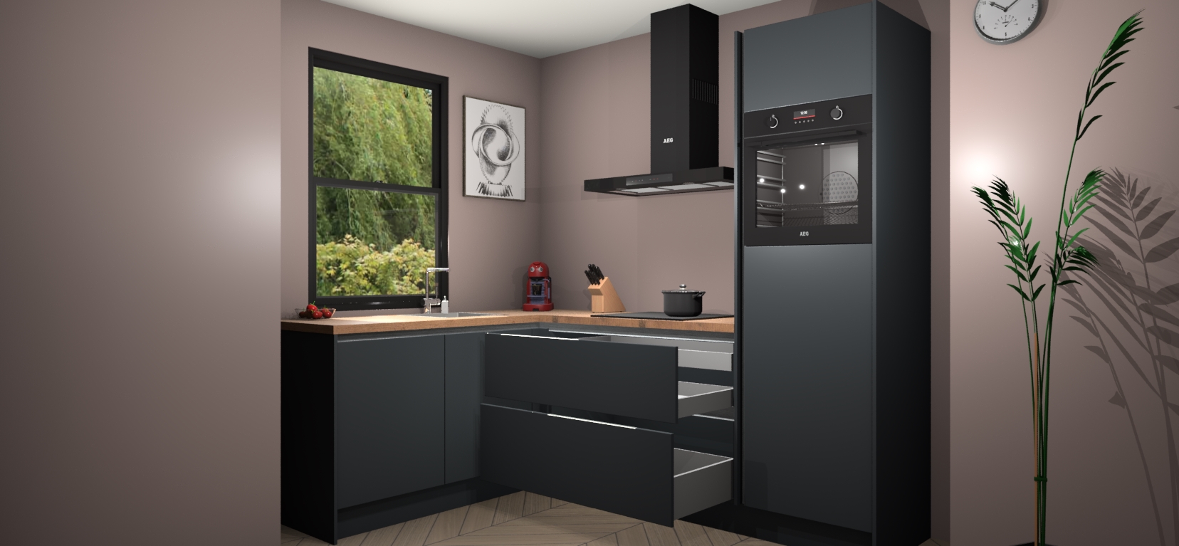 Deze prachtige hoekkeuken heeft alle benodigdheden om uw droomkook- en eetruimte compleet te maken. De Onyxgrijze kasten bieden een echo van raffinement, terwijl de 5 inbouwapparaten genoeg opties bieden voor het bereiden van heerlijke maaltijden. De oven, inductiekookplaat, afzuigkap, vaatwasser en koelkast zorgen ervoor dat u tijd in de keuken zo efficiënt mogelijk verloopt, terwijl ze ook dat extra vleugje luxe bieden.