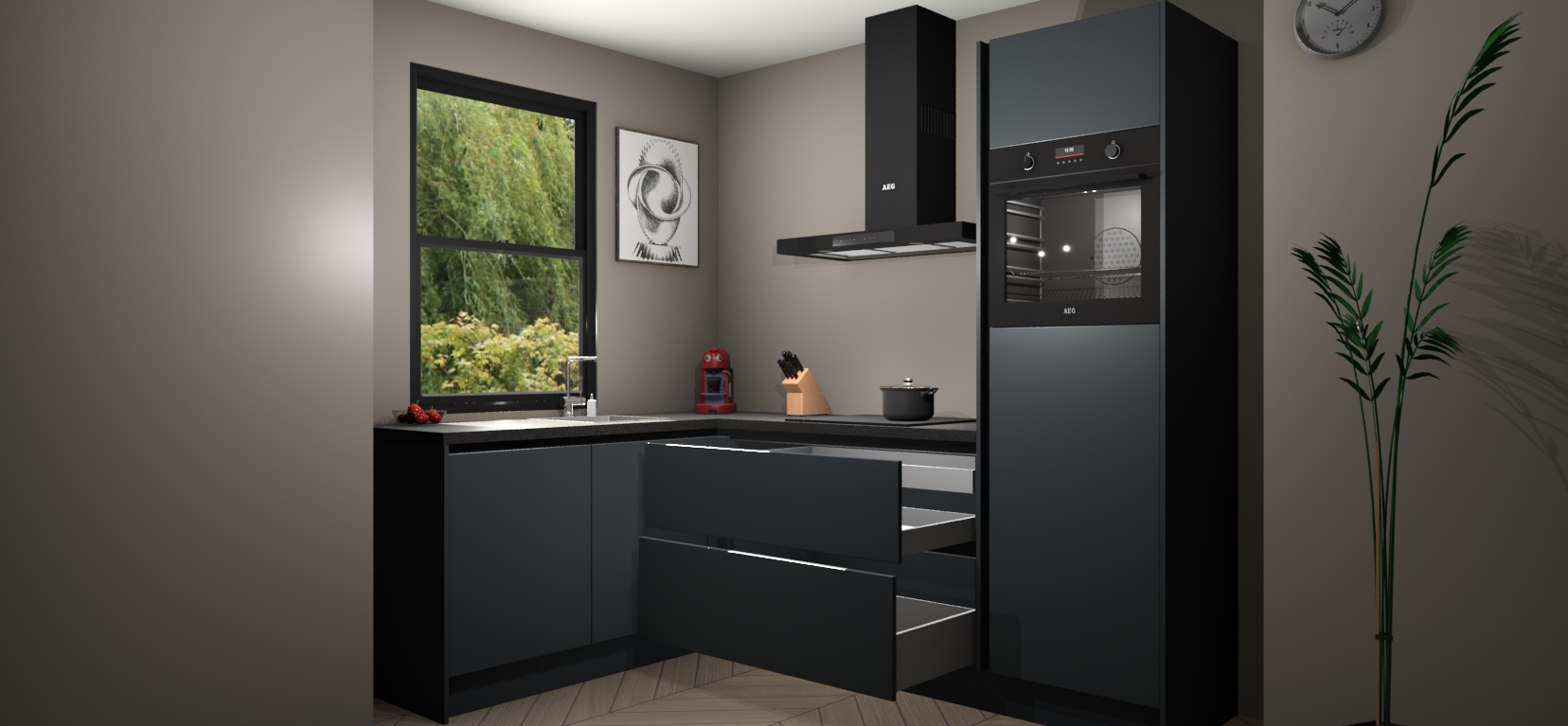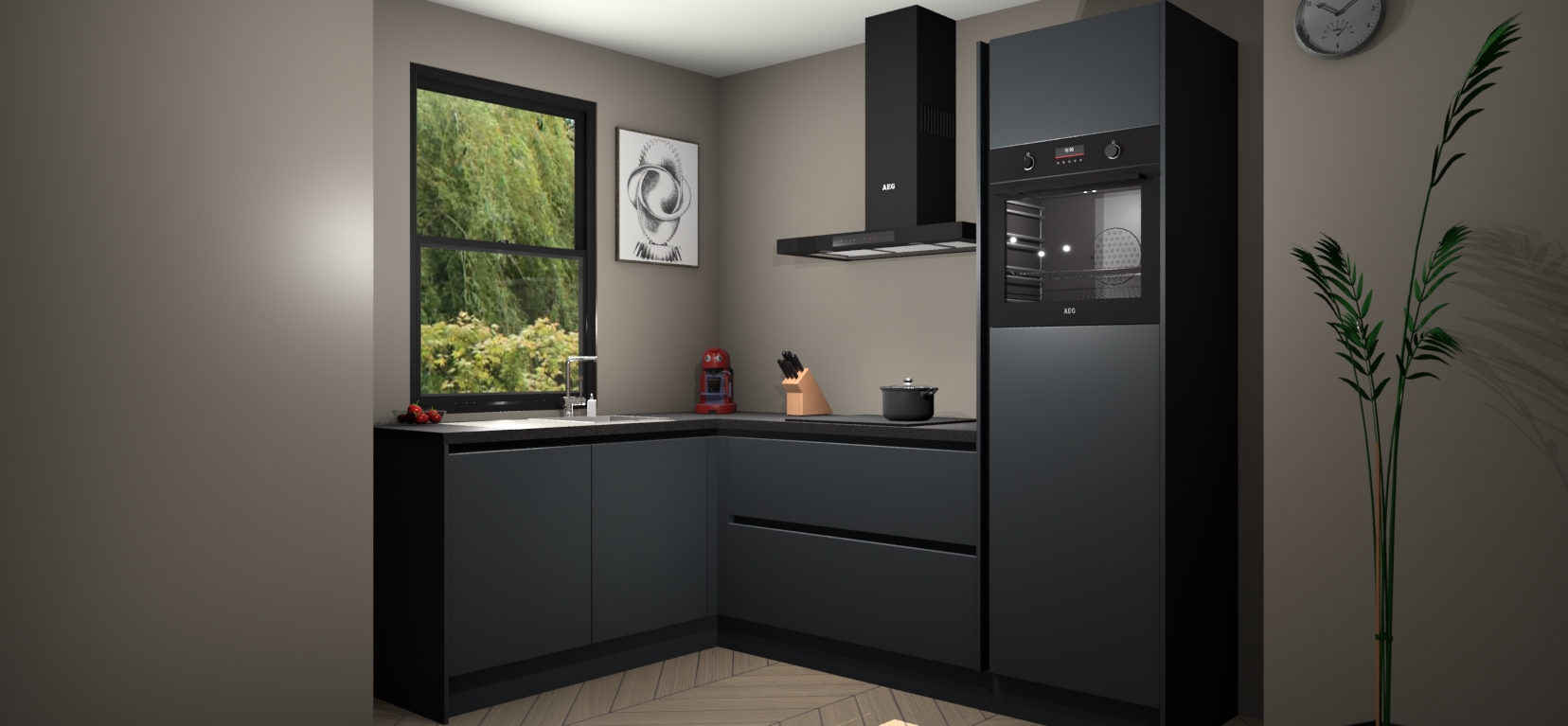 Deze prachtige hoekkeuken heeft alle benodigdheden om uw droomkook- en eetruimte compleet te maken. De Onyxgrijze kasten bieden een echo van raffinement, terwijl de 5 inbouwapparaten genoeg opties bieden voor het bereiden van heerlijke maaltijden. De oven, inductiekookplaat, afzuigkap, vaatwasser en koelkast zorgen ervoor dat u tijd in de keuken zo efficiënt mogelijk verloopt, terwijl ze ook dat extra vleugje luxe bieden.