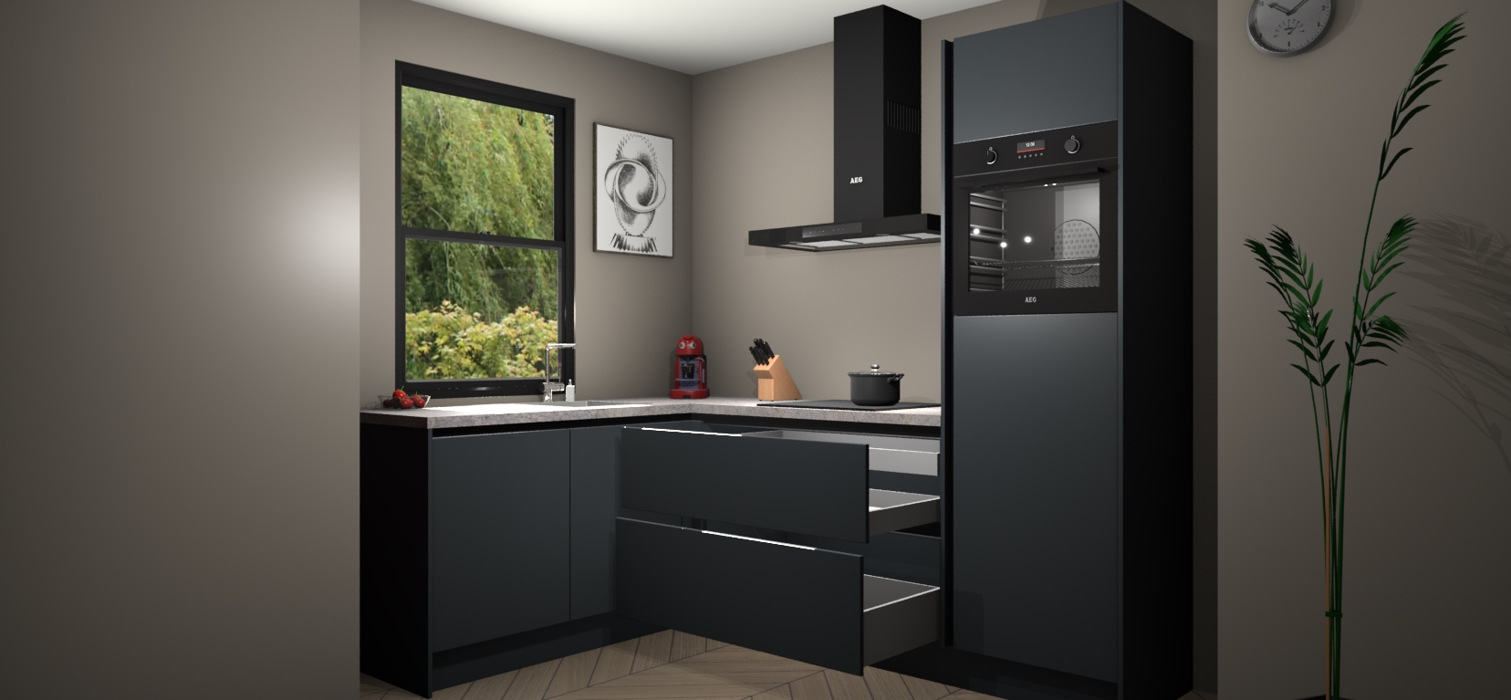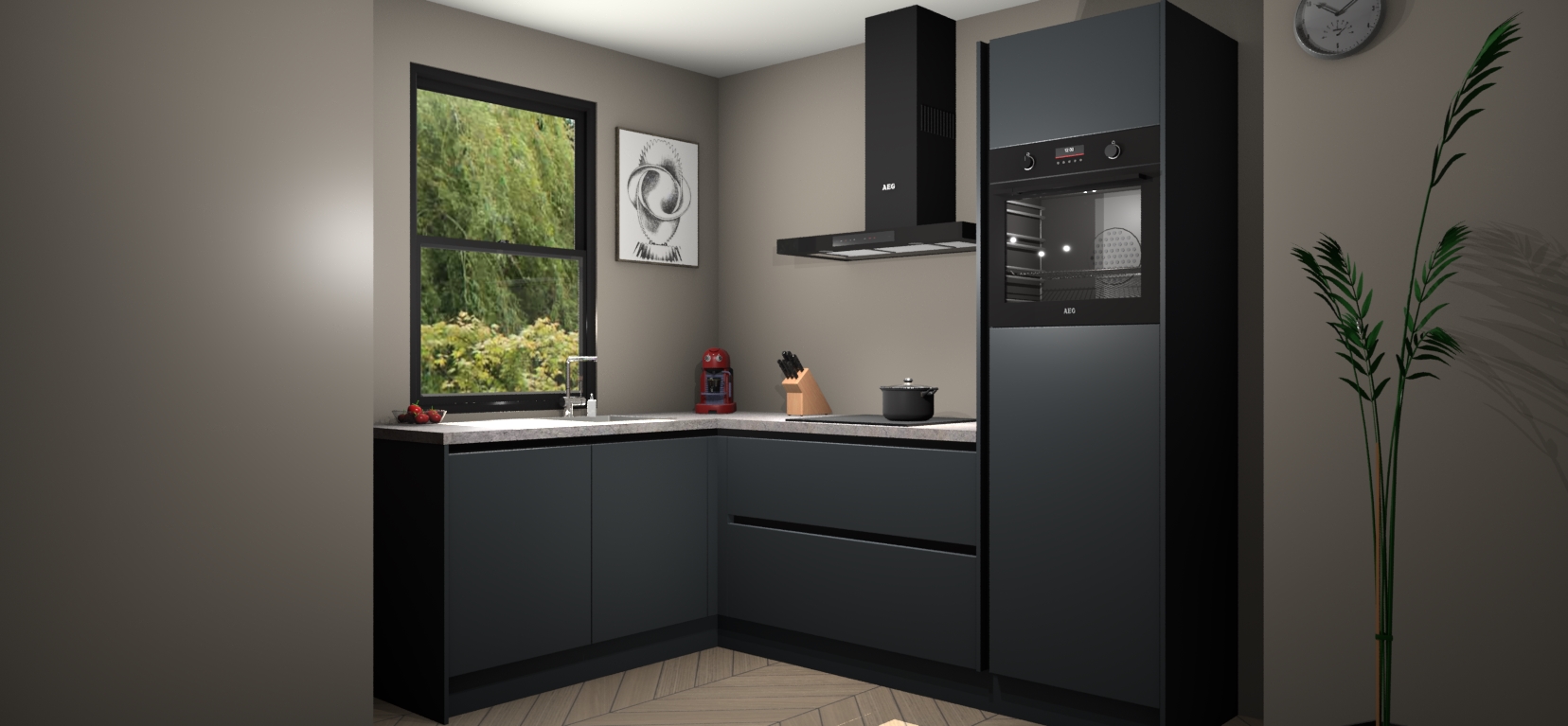Deze prachtige hoekkeuken heeft alle benodigdheden om uw droomkook- en eetruimte compleet te maken. De Onyxgrijze kasten bieden een echo van raffinement, terwijl de 5 inbouwapparaten genoeg opties bieden voor het bereiden van heerlijke maaltijden. De oven, inductiekookplaat, afzuigkap, vaatwasser en koelkast zorgen ervoor dat u tijd in de keuken zo efficiënt mogelijk verloopt, terwijl ze ook dat extra vleugje luxe bieden.