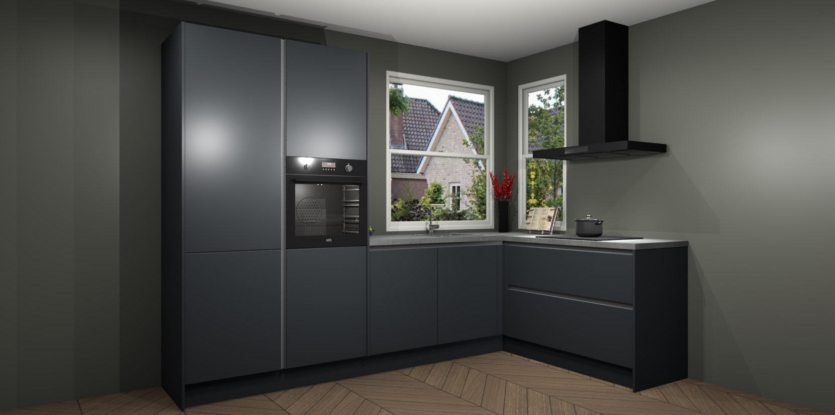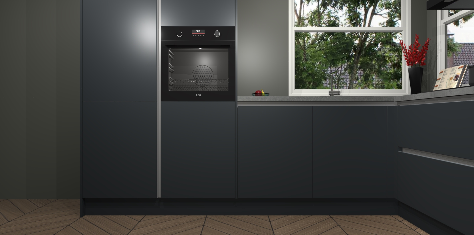 De Onyxgrijze greeploze keuken Kotor wordt geleverd met vijf inbouwapparaten, waaronder een oven, inductiekookplaat, afzuigkap, vaatwasser en koelkast. En als u uw apparatuur wilt upgraden, kunnen we u na bestelling eenvoudig helpen overstappen naar AEG. Bovendien heeft deze keuken soft close deuren, zodat lades en kastjes geruisloos en zonder klepperen sluiten!
