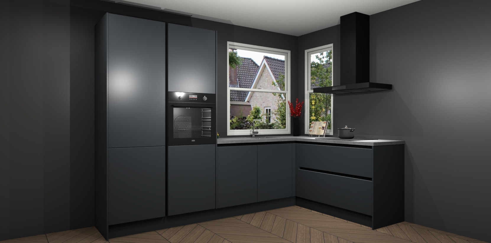 De Onyxgrijze greeploze keuken Kotor wordt geleverd met vijf inbouwapparaten, waaronder een oven, inductiekookplaat, afzuigkap, vaatwasser en koelkast. En als u uw apparatuur wilt upgraden, kunnen we u na bestelling eenvoudig helpen overstappen naar AEG. Bovendien heeft deze keuken soft close deuren, zodat lades en kastjes geruisloos en zonder klepperen sluiten!