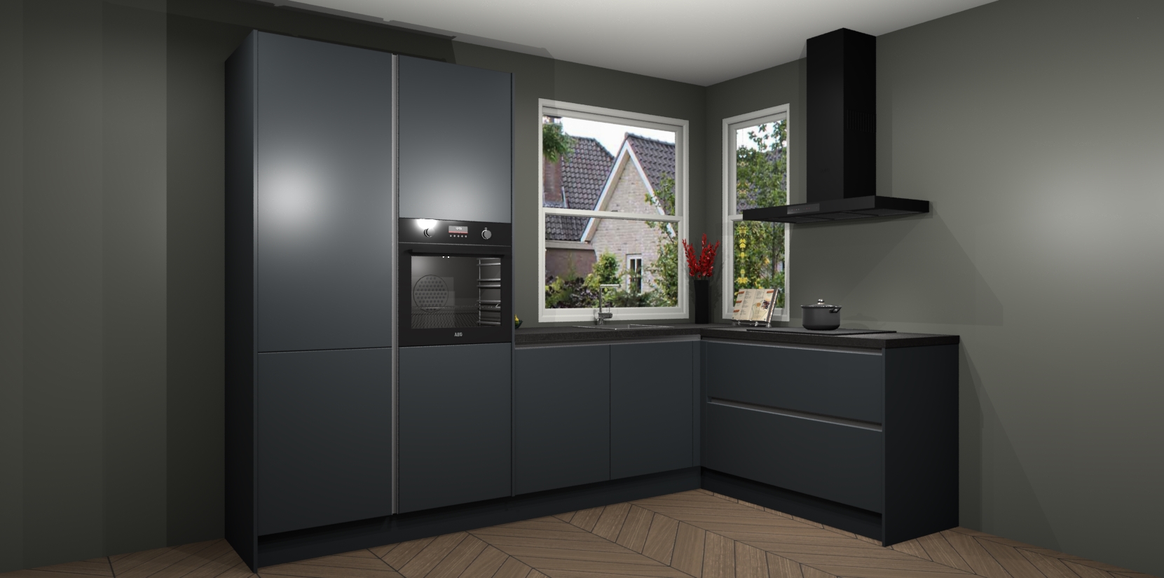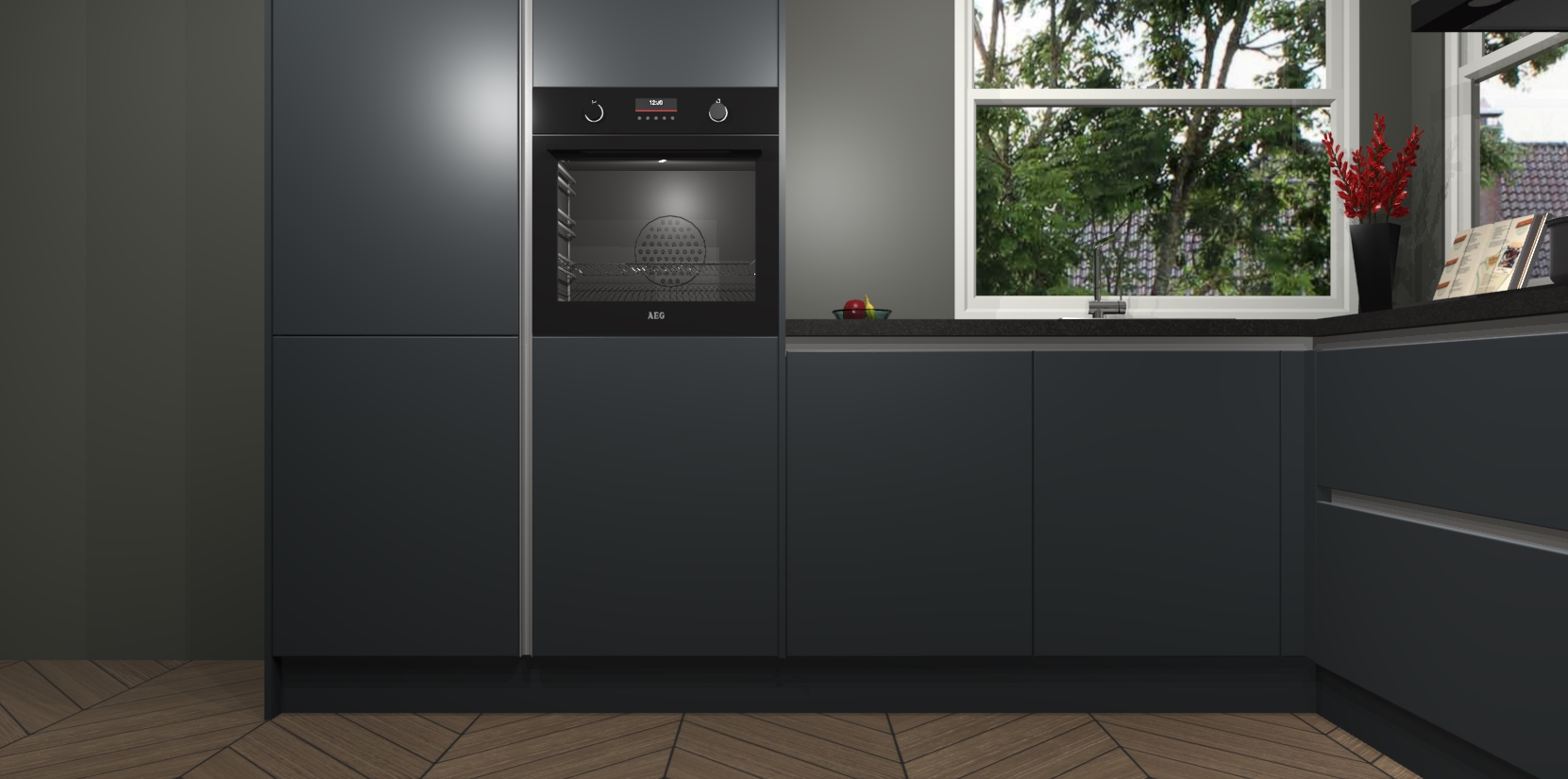 De Onyxgrijze greeploze keuken Kotor wordt geleverd met vijf inbouwapparaten, waaronder een oven, inductiekookplaat, afzuigkap, vaatwasser en koelkast. En als u uw apparatuur wilt upgraden, kunnen we u na bestelling eenvoudig helpen overstappen naar AEG. Bovendien heeft deze keuken soft close deuren, zodat lades en kastjes geruisloos en zonder klepperen sluiten!