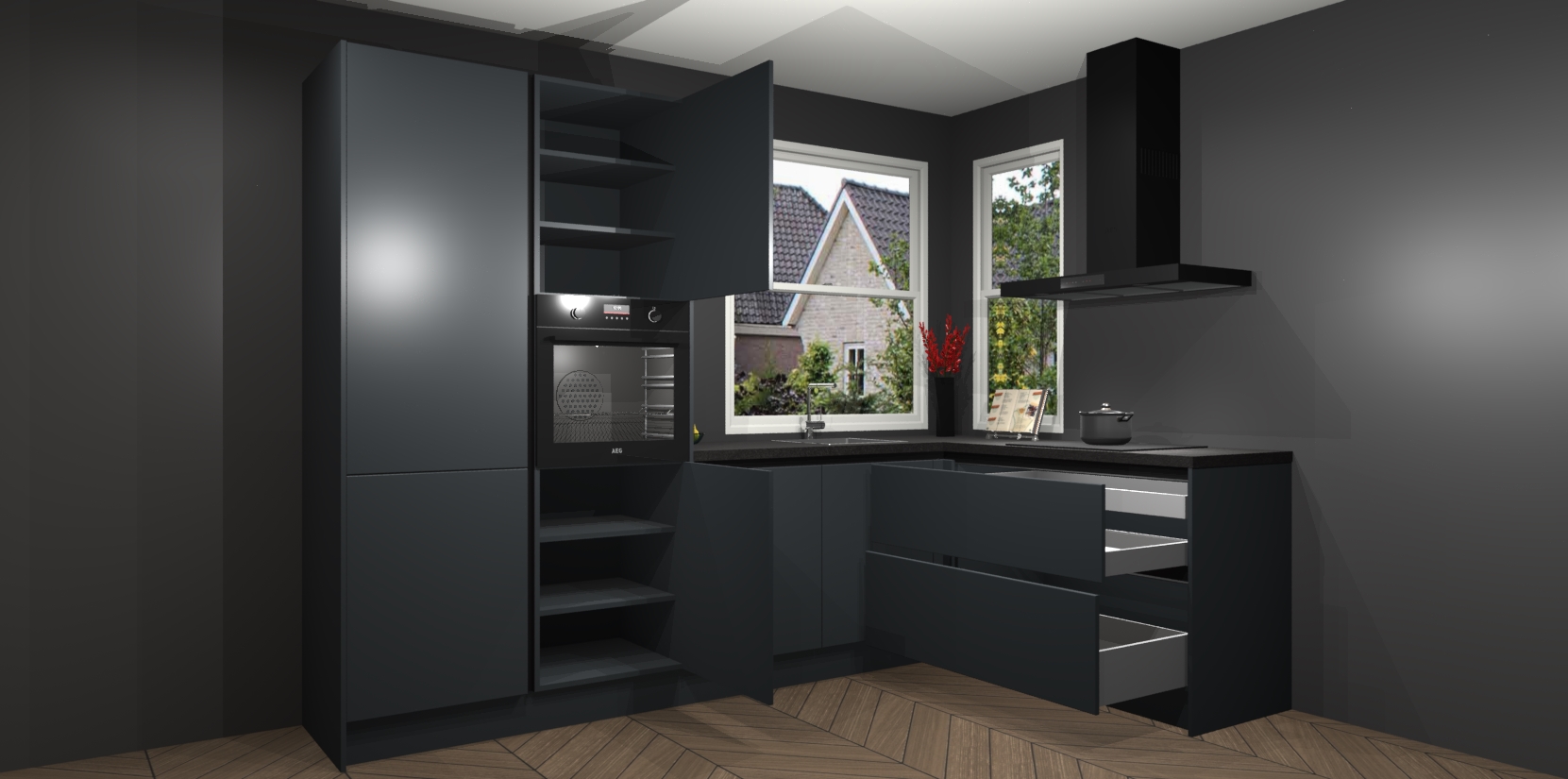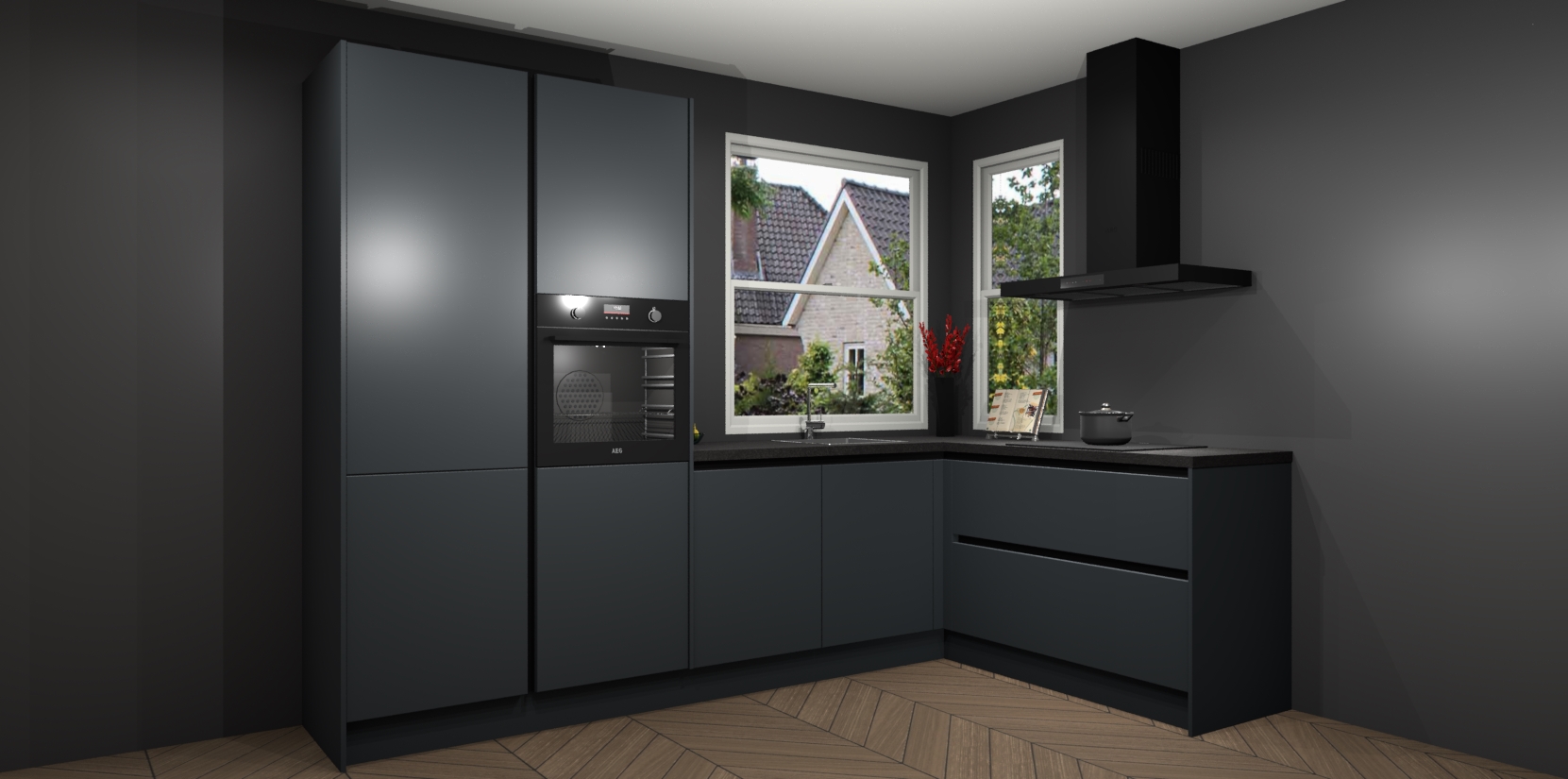 De Onyxgrijze greeploze keuken Kotor wordt geleverd met vijf inbouwapparaten, waaronder een oven, inductiekookplaat, afzuigkap, vaatwasser en koelkast. En als u uw apparatuur wilt upgraden, kunnen we u na bestelling eenvoudig helpen overstappen naar AEG. Bovendien heeft deze keuken soft close deuren, zodat lades en kastjes geruisloos en zonder klepperen sluiten!