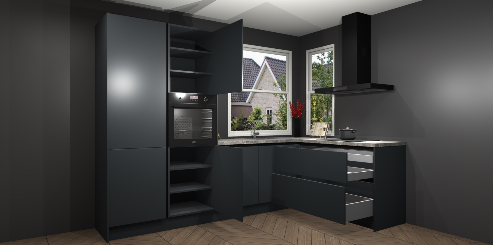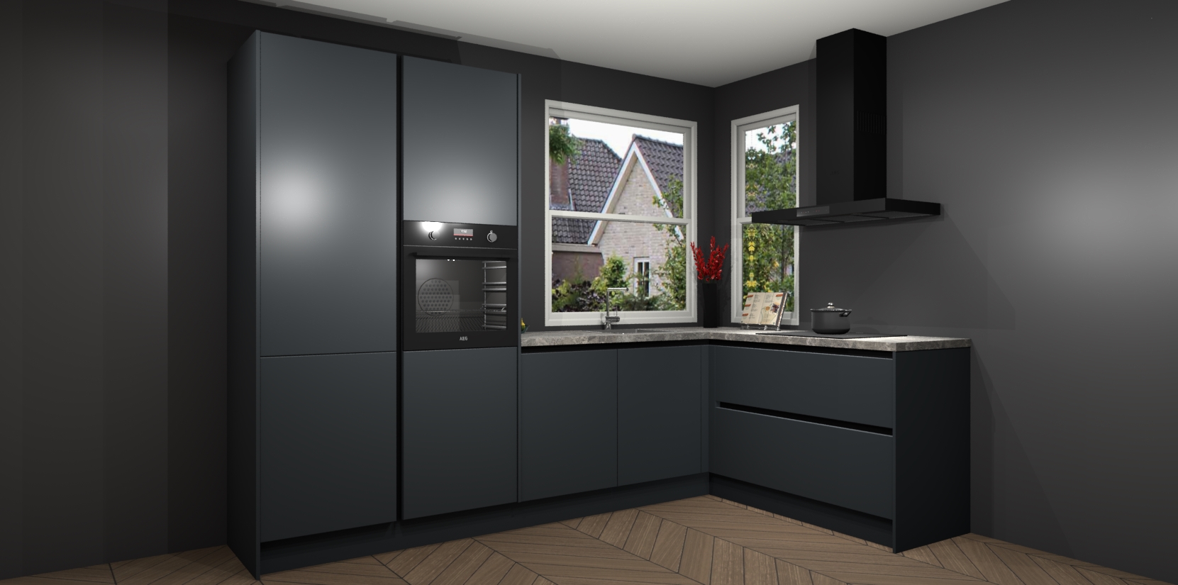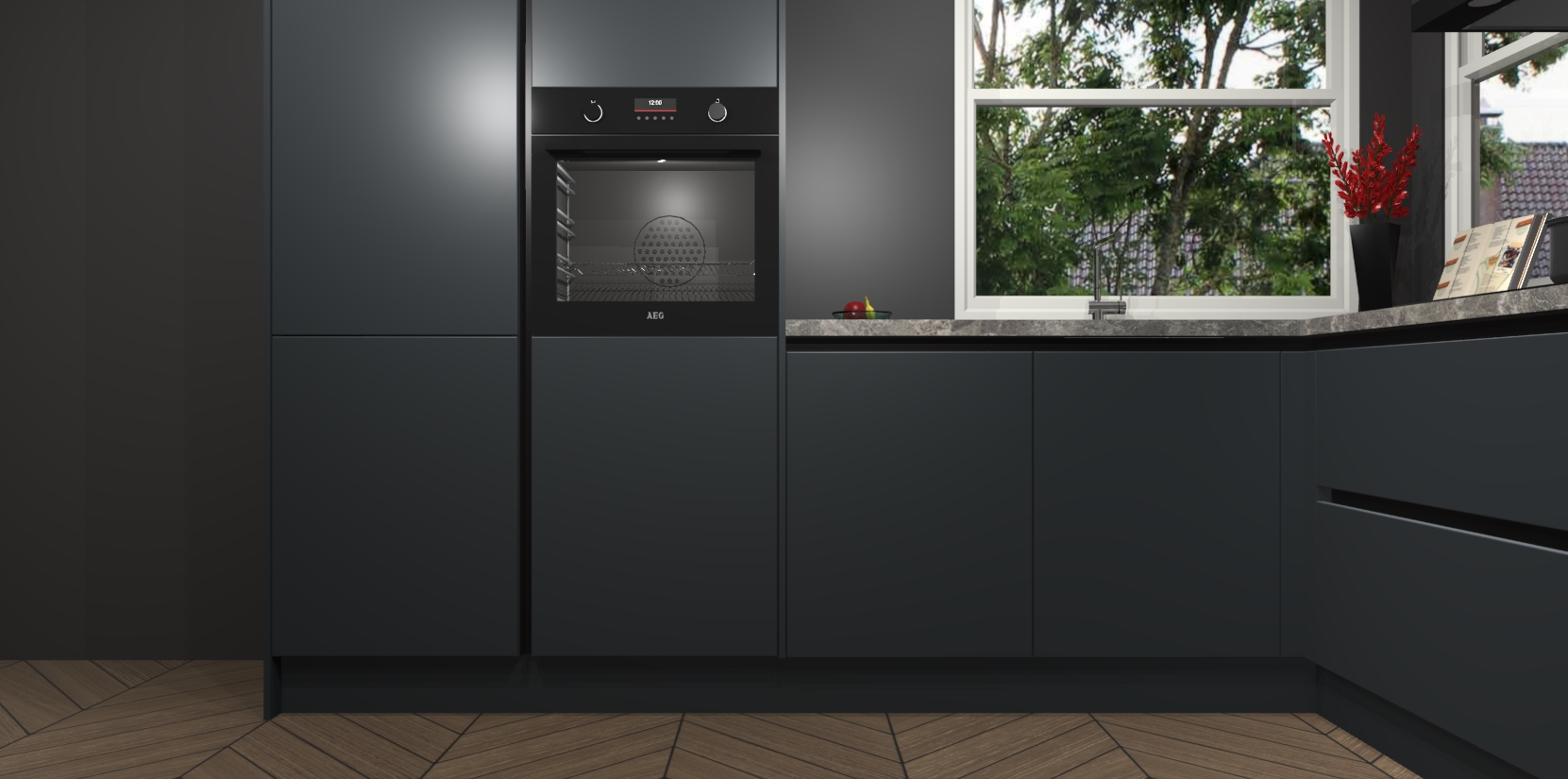 De Onyxgrijze greeploze keuken Kotor wordt geleverd met vijf inbouwapparaten, waaronder een oven, inductiekookplaat, afzuigkap, vaatwasser en koelkast. En als u uw apparatuur wilt upgraden, kunnen we u na bestelling eenvoudig helpen overstappen naar AEG. Bovendien heeft deze keuken soft close deuren, zodat lades en kastjes geruisloos en zonder klepperen sluiten!