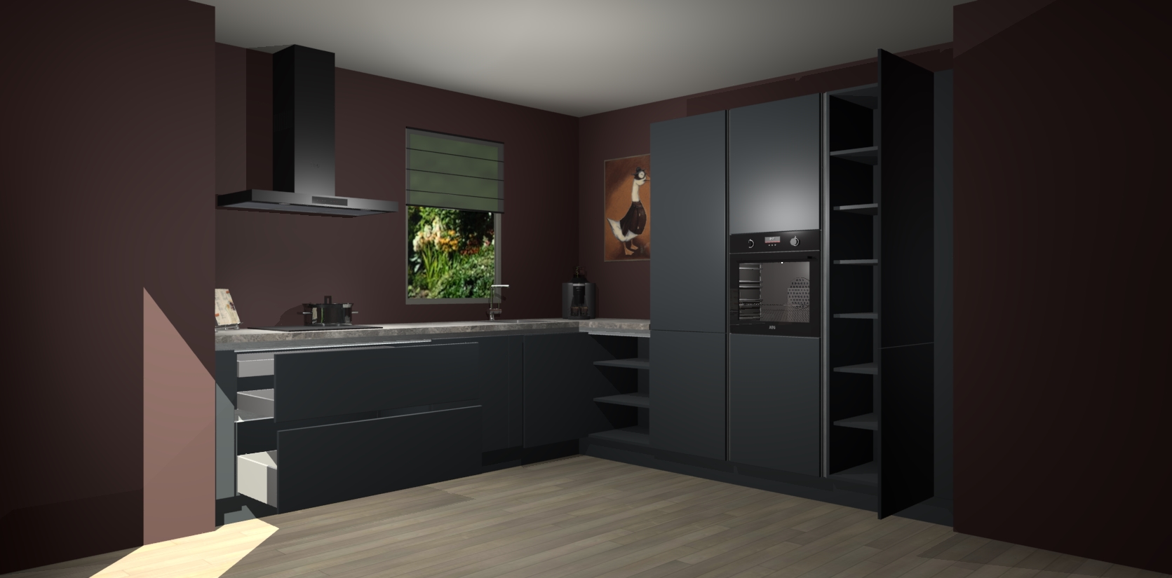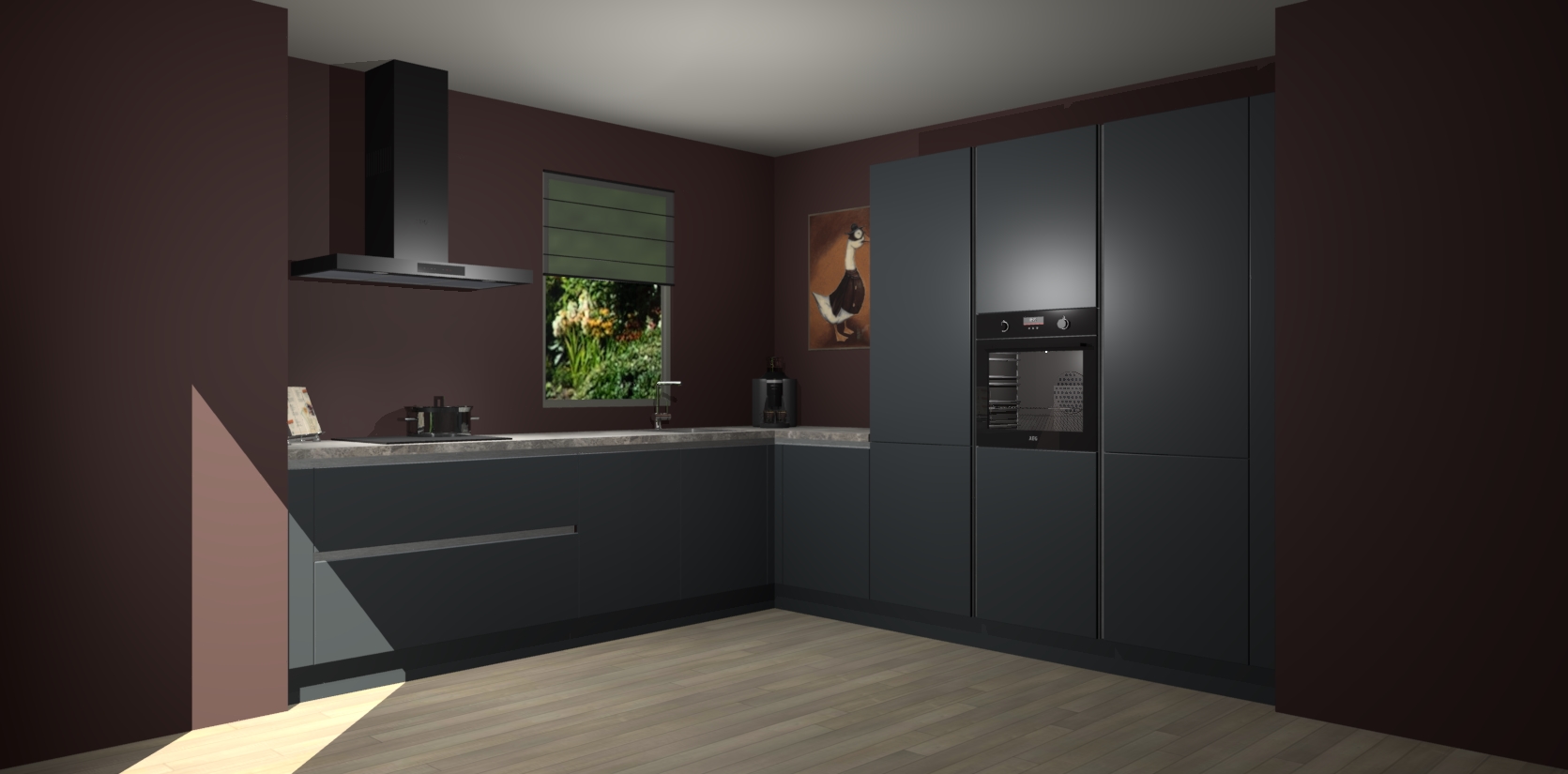 Welkom bij de onyxgrijze greeploze keuken Laos. Deze prachtige keuken zal de komende jaren het middelpunt van de belangstelling in uw huis zijn. Uitgerust met vijf inbouwapparaten komt u nooit kookgereedschap tekort. Bovendien geeft de warme houtlook elke ruimte een uitnodigende en tijdloze uitstraling.