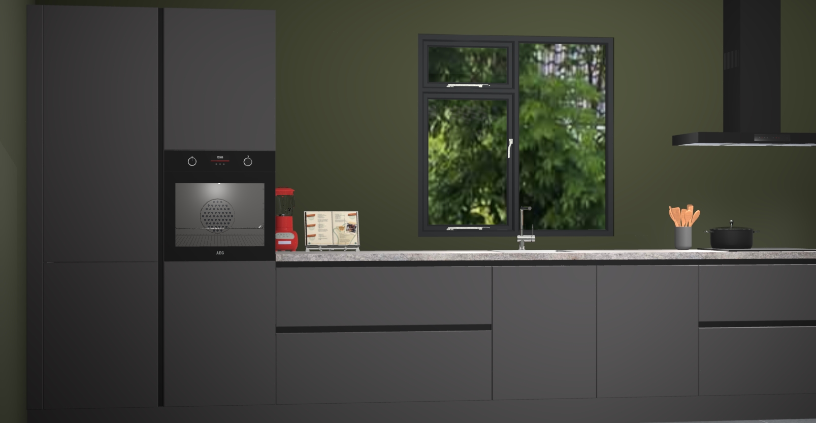 De Onyxgrijze keuken Lille wordt geleverd met vijf inbouwapparaten - een oven, inductiekookplaat, afzuigkap, vaatwasser en koelkast. Maar dat is nog niet alles! Na bestelling kunnen deze apparaten eenvoudig worden geüpgraded naar premium AEG-apparatuur. Bovendien is er zelfs de optie om de oven te vervangen door een combimagnetron of uw inductiekookplaat te vervangen door een kookplaat met geïntegreerde afzuiging.