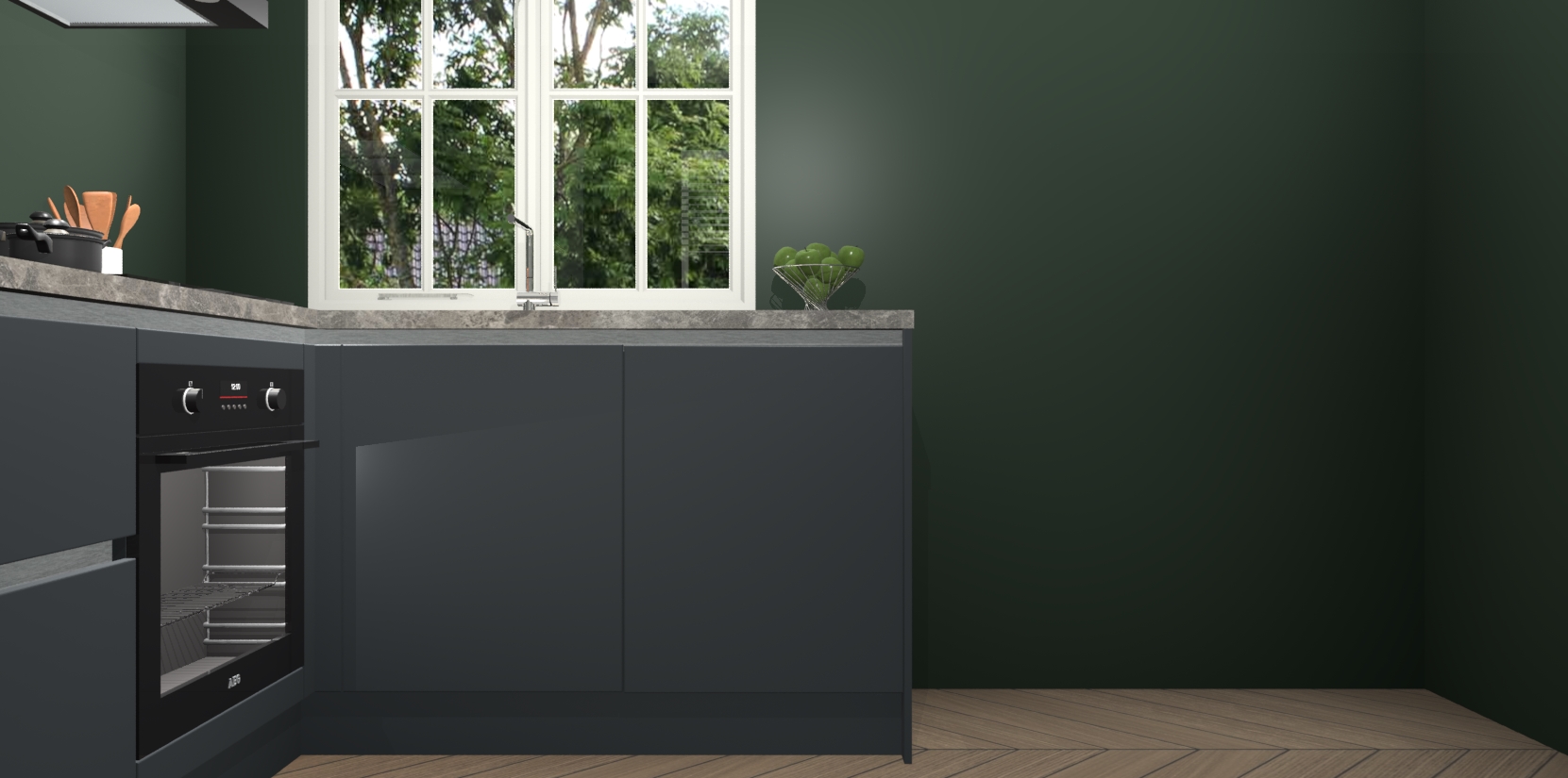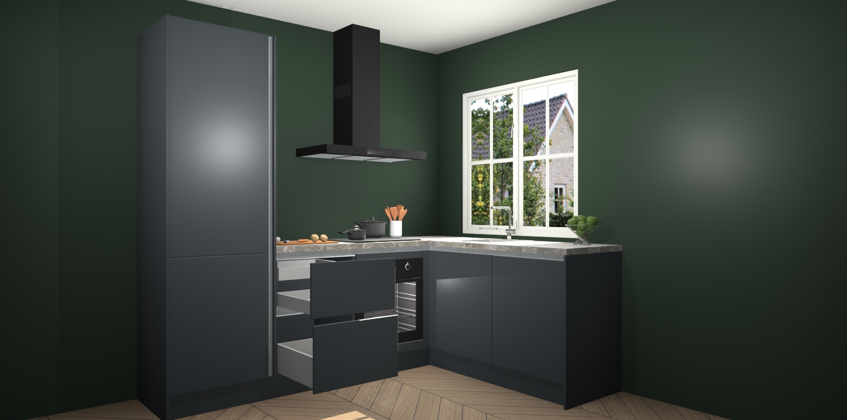 De Onyxgrijze greeploze keuken Linz is de perfecte keuze voor uw nieuwe moderne en tijdloze keuken. Ga voor moderne en tijdloze elegantie in uw keuken. De prachtige hoekkeuken biedt een verfrissende kijk op de manier waarop we ons vertrouwde keukenontwerp kunnen aanpassen in een nieuwe stijl. Één blik om alles te zien: zo mooi dat het bijna magisch lijkt.