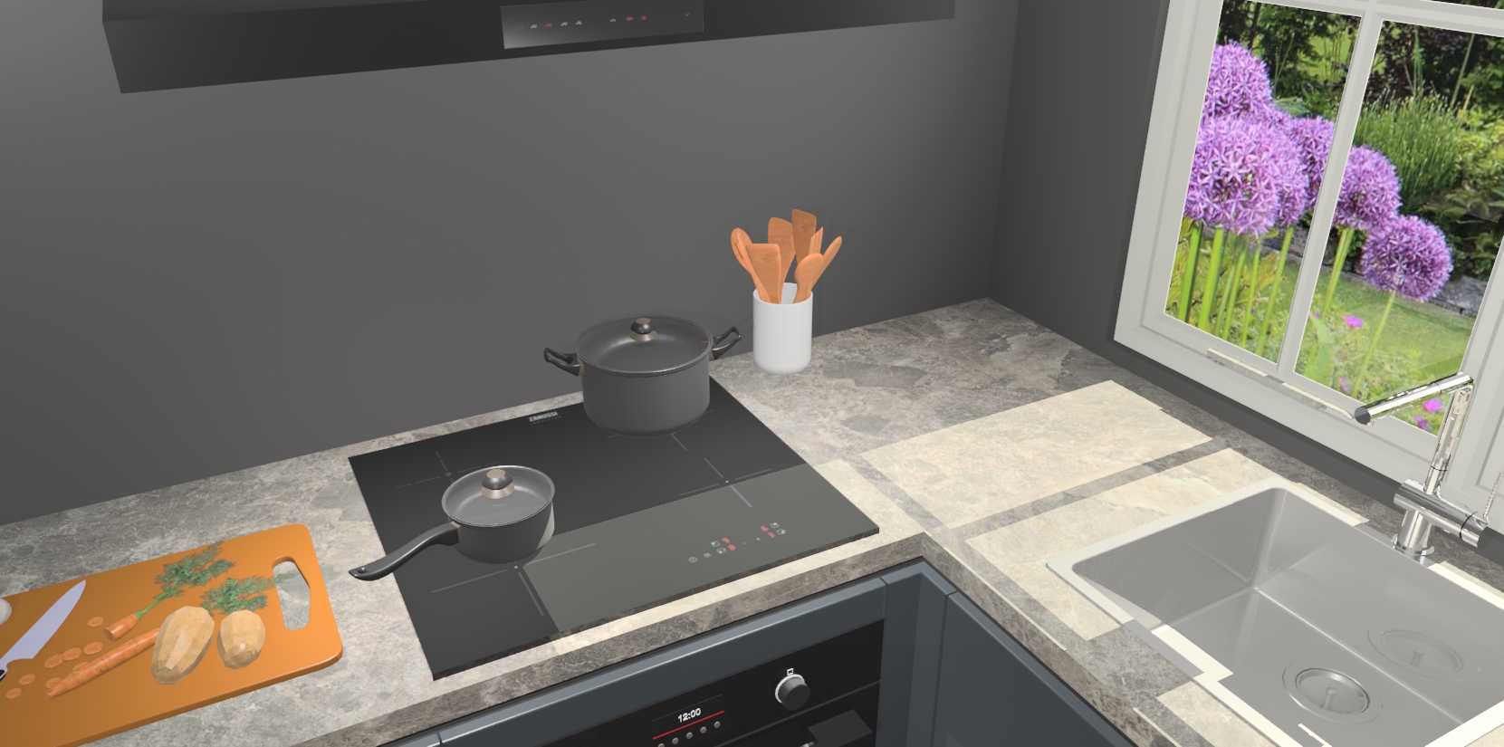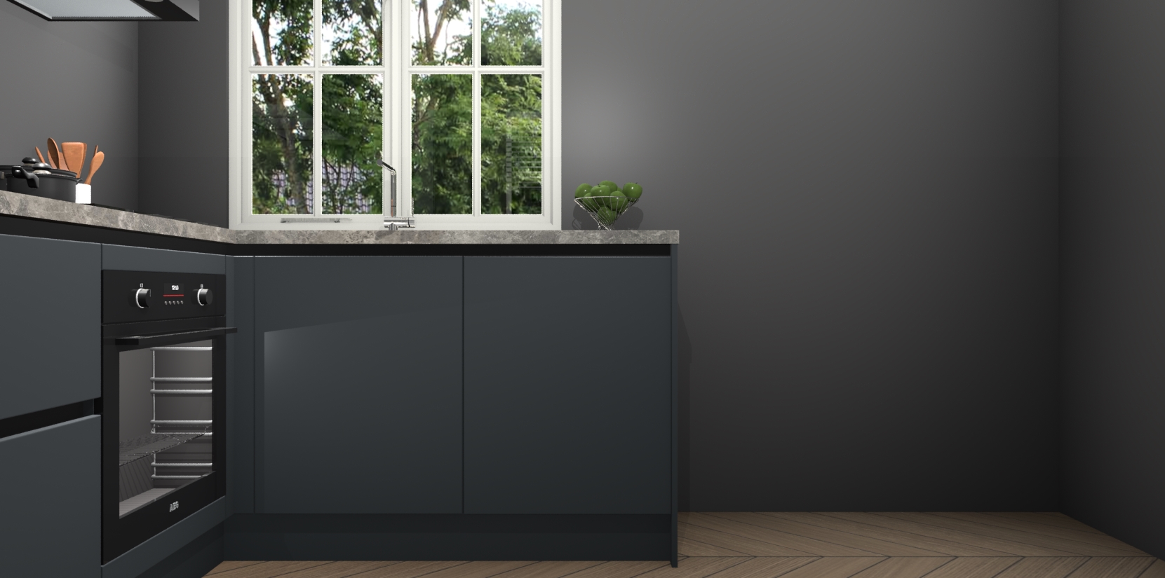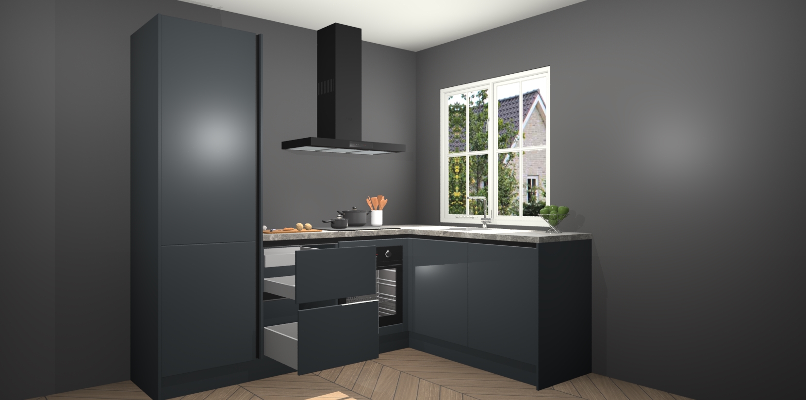 De Onyxgrijze greeploze keuken Linz is de perfecte keuze voor uw nieuwe moderne en tijdloze keuken. Ga voor moderne en tijdloze elegantie in uw keuken. De prachtige hoekkeuken biedt een verfrissende kijk op de manier waarop we ons vertrouwde keukenontwerp kunnen aanpassen in een nieuwe stijl. Één blik om alles te zien: zo mooi dat het bijna magisch lijkt.