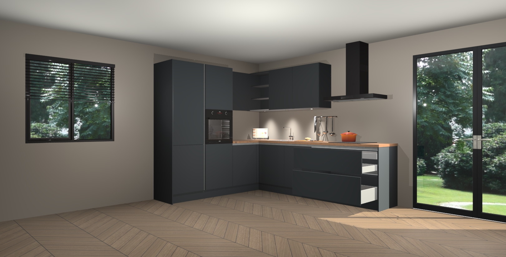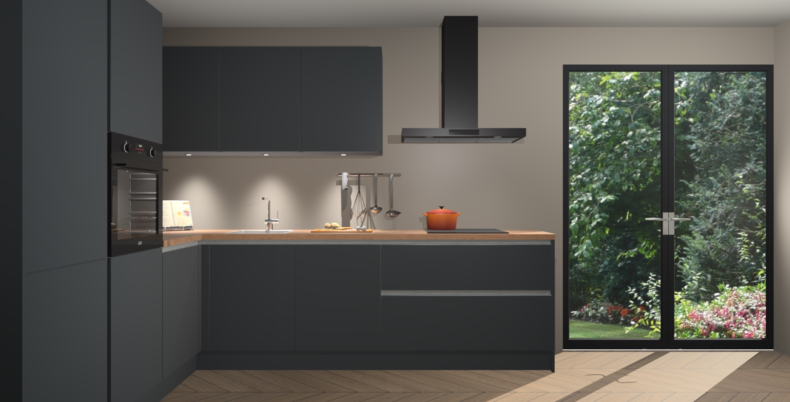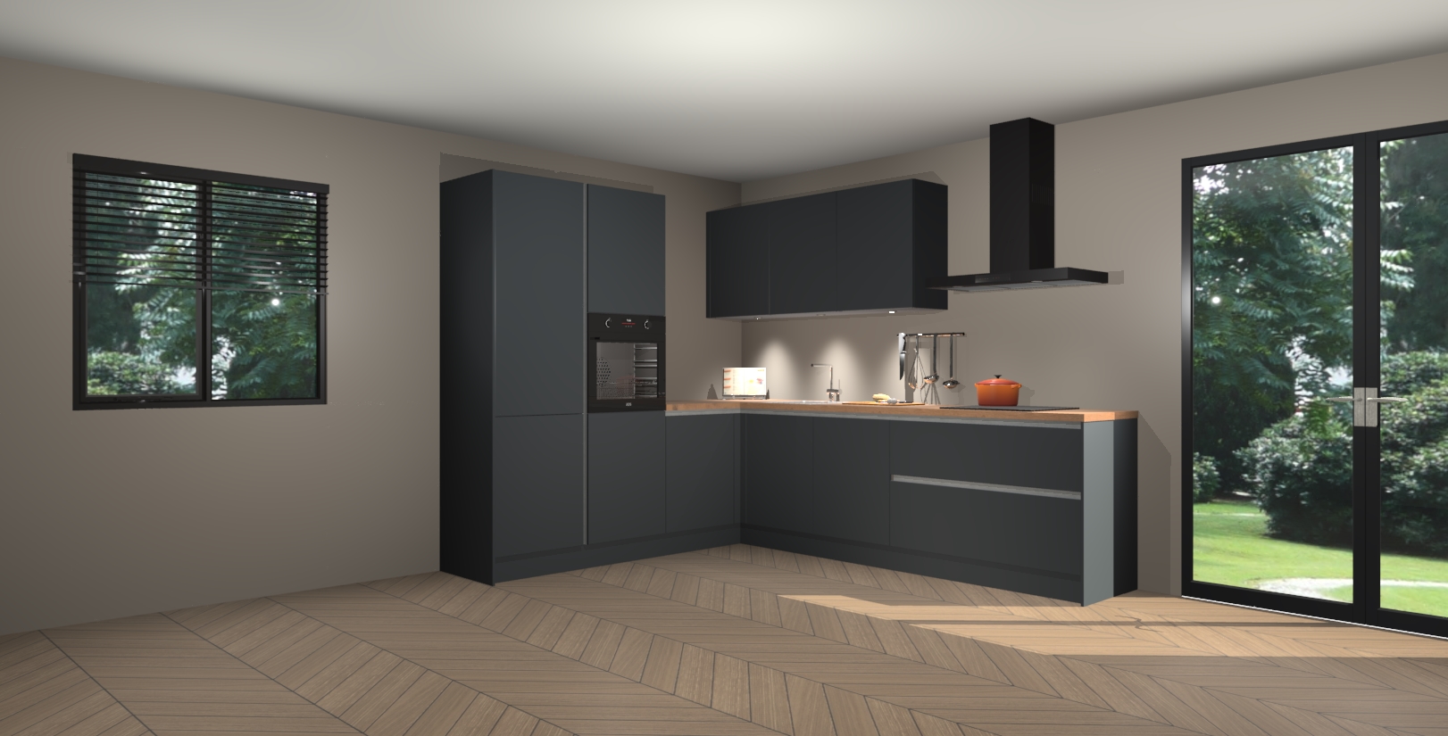 Maak kennis met de onyxgrijze greeploze keuken Parla - de perfecte aanvulling voor uw moderne keuken! Ervaar tijdloos design, elegantie en een chique uitstraling met onze zwarte handgrepen, soft-close deuren en veel opbergruimte. Dit alles wordt aangeboden tegen een vaste lage prijs voor ongeëvenaarde Duitse keukenkwaliteit!