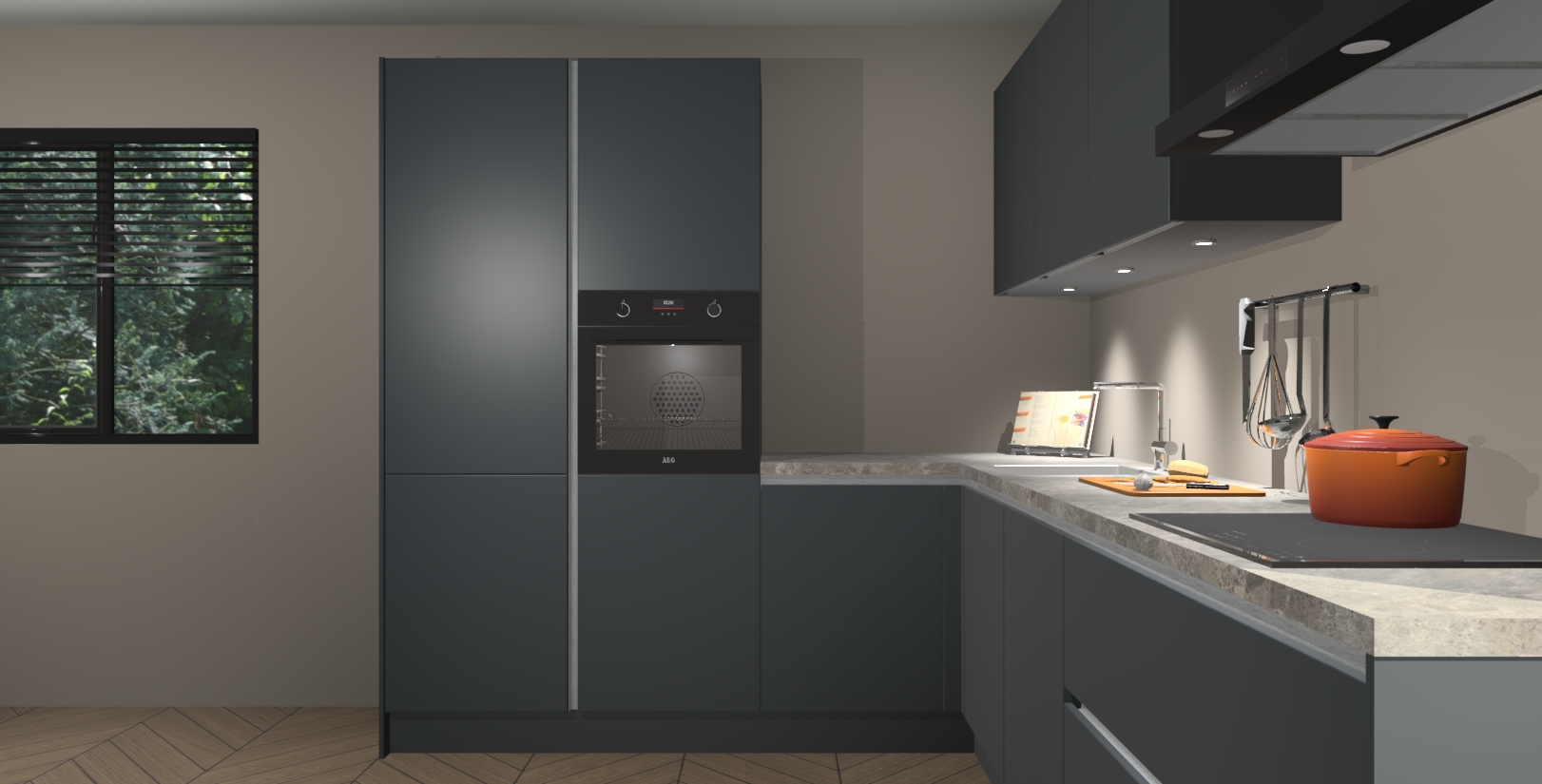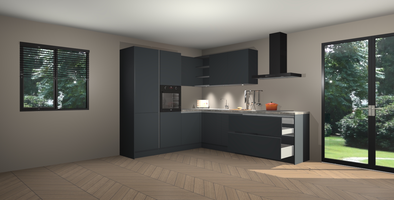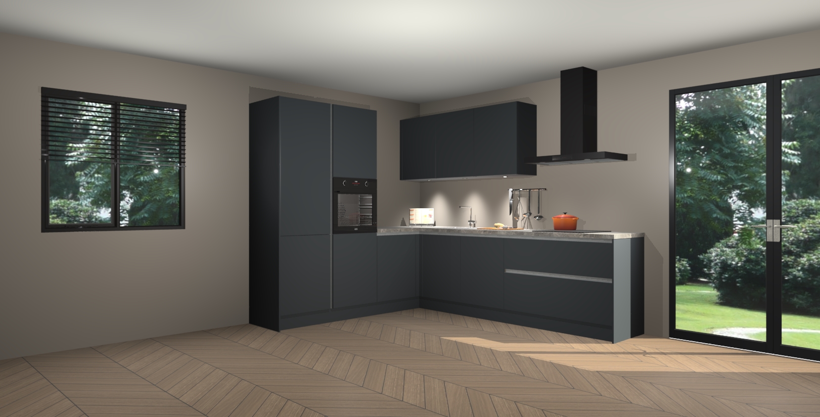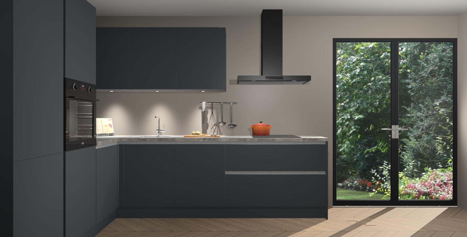 Maak kennis met de onyxgrijze greeploze keuken Parla - de perfecte aanvulling voor uw moderne keuken! Ervaar tijdloos design, elegantie en een chique uitstraling met onze zwarte handgrepen, soft-close deuren en veel opbergruimte. Dit alles wordt aangeboden tegen een vaste lage prijs voor ongeëvenaarde Duitse keukenkwaliteit!