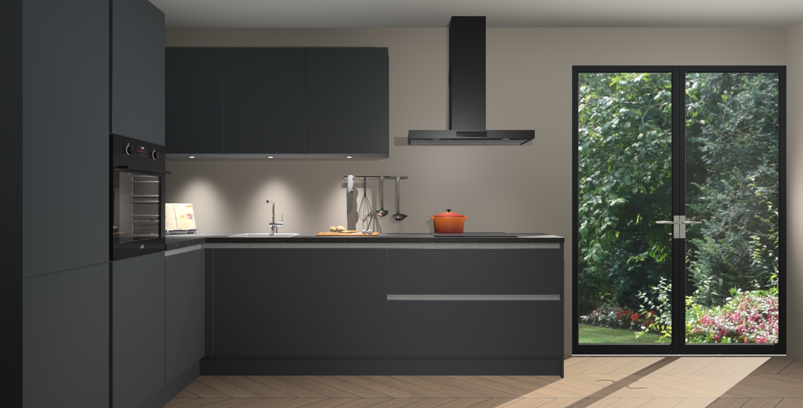 Met de onyxgrijze greeploze keuken Parla Maakt u van uw keuken het pronkstuk van uw huis. Stijlvol en toch praktisch, de nieuwste look voor wie meer waarde en charme aan zijn huis wil toevoegen. Met prachtige zwarte handgrepen die zich lenen voor een klassieke stijlbron, zal u niet teleurgesteld zijn in het resultaat. De soft-close deurscharnieren geven een gevoel van luxe omdat ze zachtjes bewegen zonder storende of krakende geluiden te veroorzaken.
