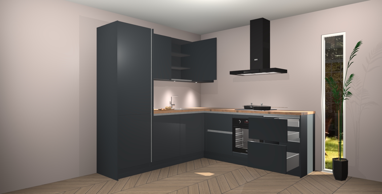 Met zijn moderne design en aantrekkelijke hoekopstelling biedt deze keuken een unieke look die zelfs de meest veeleisende huiseigenaar zal bevallen. En omdat de binnenkant van de kasten dezelfde kleur heeft als de buitenkant, heeft uw keuken een consistente afwerking. Bovenop de geweldige look is opbergruimte ook geen probleem, met voldoende kast- en laderuimte achter zelfs de mooiste buitenkant.