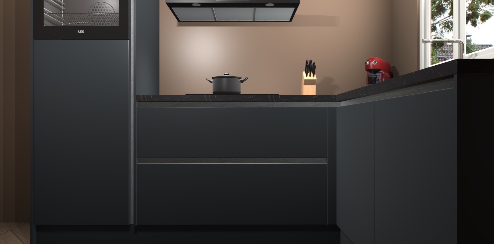 Dit model biedt u voldoende opbergruimte en vijf ingebouwde apparaten: een oven, inductiekookplaat, afzuigkap, vaatwasser en koelkast. Deze apparaten kunnen gemakkelijk worden geüpgrade naar AEG nadat u besteld heeft. De verschillende laden en kastjes bevatten softclose-deuren waardoor ze gezellig dichtvallen met een geruststellend helemaal geruisloos geluid. En dat is nog niet alles! We garanderen ook dat de prijs altijd laag blijft - dus haal nu uw Onyxgrijze greeploze keuken Victoria terwijl het kan.