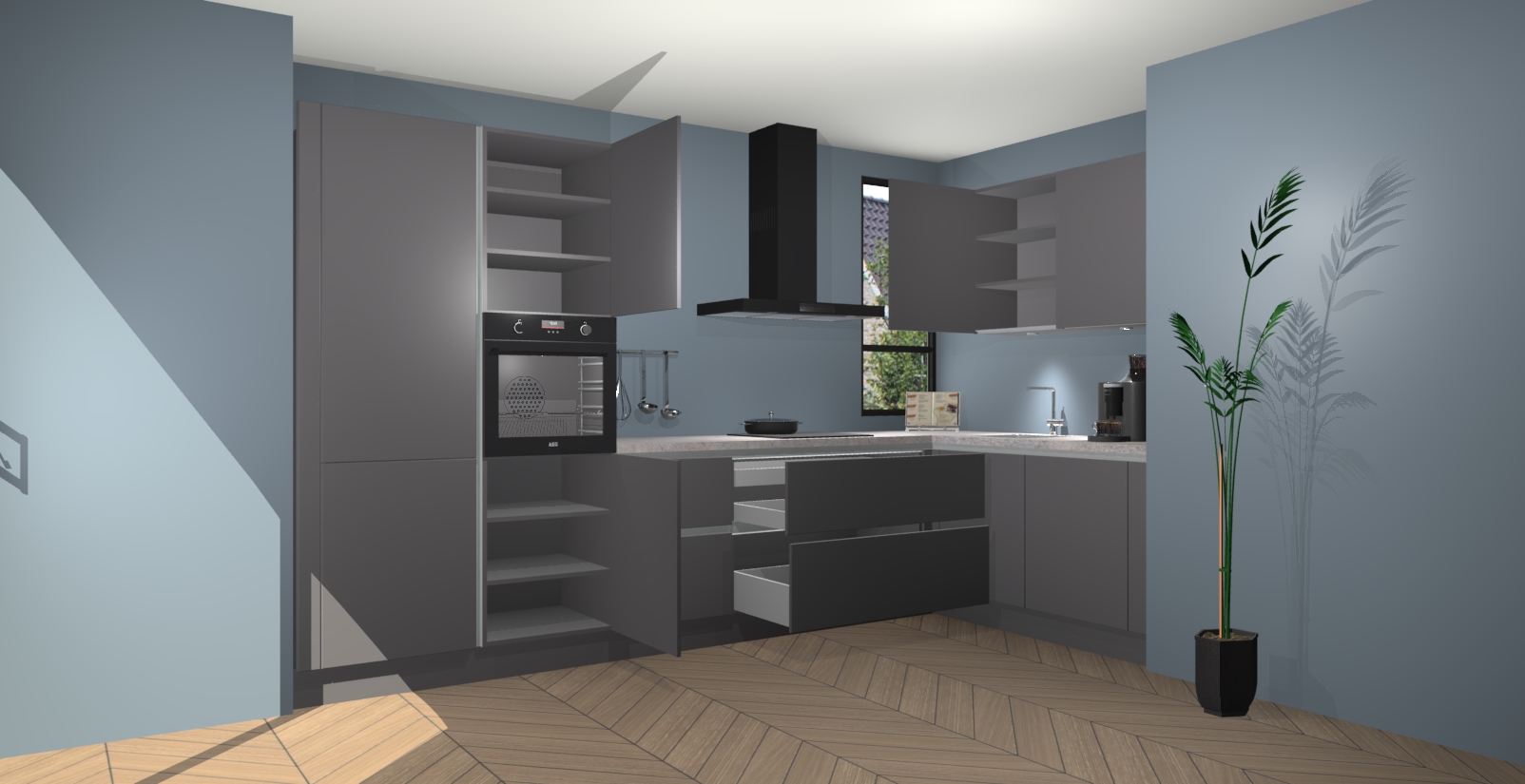 Welkom in uw nieuwe moderne keuken! Laat ons u voorstellen aan de Onyxgrijze greeploze keuken Vlaanderen . Deze prachtige hoekkeuken straalt exclusiviteit en luxe uit als geen ander. Het strakke design, de tijdloze kleuren en het greeploze model maken van deze keuken een moderne klassieker. En met voldoende opbergruimte heeft deze keuken echt voor ieder wat wils.