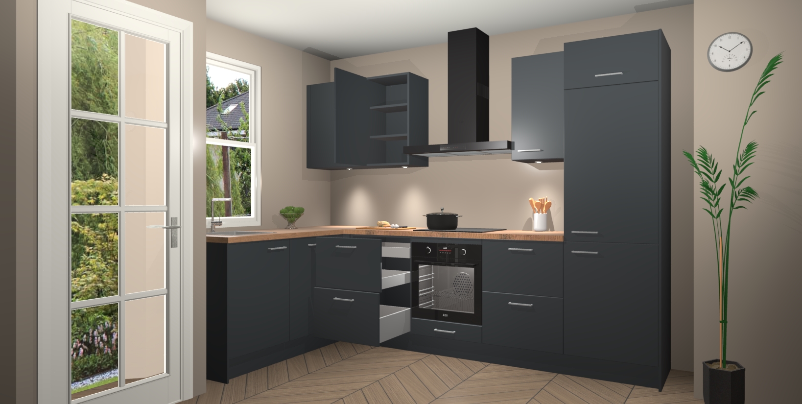 Bent u op zoek naar een strakke, moderne hoekkeuken die uw huis oppept en een moderne uitstraling geeft? Kijk dan niet verder dan de onyxgrijze keuken Beijing. Deze verbluffende hoekkeuken tilt hedendaags design naar een hoger niveau. Qua stijl is deze chique hoekkeuken voorzien van onyxgrijze accenten, om een strakke maar opvallende look te creëren. De binnenkant van de kasten is afgewerkt in dezelfde prachtige onyxgrijze kleur voor extra esthetische aantrekkingskracht.