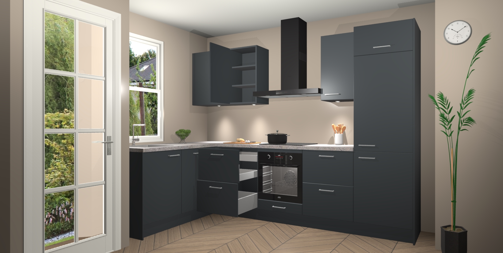 De soft-close deuren zorgen ervoor dat alles mooi dicht zit, zodat uw kasten er nog jaren als nieuw uitziet. Als u op zoek bent naar een chique, stijlvolle upgrade van uw hoekkeuken, overweeg dan zeker de geweldige onyxgrijze keuken van Beijing!