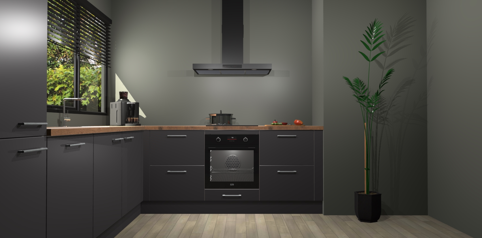 Met een modern, tijdloos design en ruime opslagruimte, zult u zich in no-time thuis voelen in uw nieuwe keuken. Uw leven wordt eenvoudiger met de soft-close deuren die voor het ultieme stille comfort zorgen - geen geluid dat u stoort terwijl u kookt. Ook is de keuken voorzien van 5 ingebouwde apparaten: een oven, inductie kookplaat, afzuigkap, vaatwasser en koelkast. Deze kunnen gemakkelijk na bestelling worden bijgewerkt naar AEG - waardoor uw luxe ervaring compleet is.