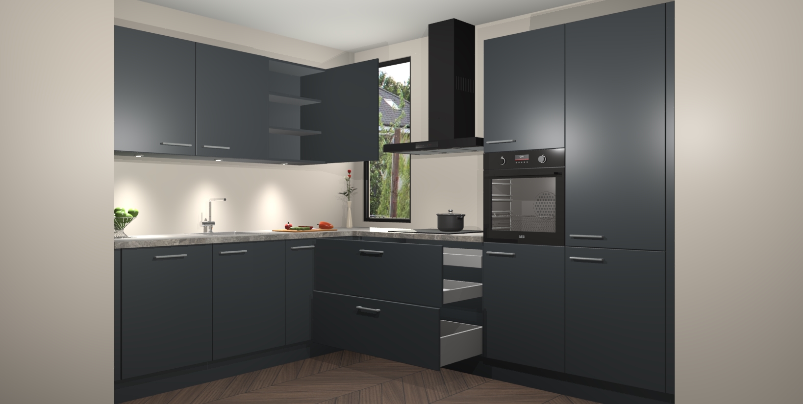 De ruime opbergruimte van dit model maakt het bereiden van voedsel en het gebruik van apparaten snel en gemakkelijk. Het beste van alles is dat het wordt geleverd met vijf inbouwapparaten: een oven, inductiekookplaat, afzuigkap, vaatwasser en koelkast - die allemaal gemakkelijk kunnen worden opgewaardeerd naar AEG na aankoop. Wat de gemaksfactor nog groter maakt, is het feit dat alle cabines voorgemonteerd worden geleverd, zodat u er meteen mee aan de slag kunt!