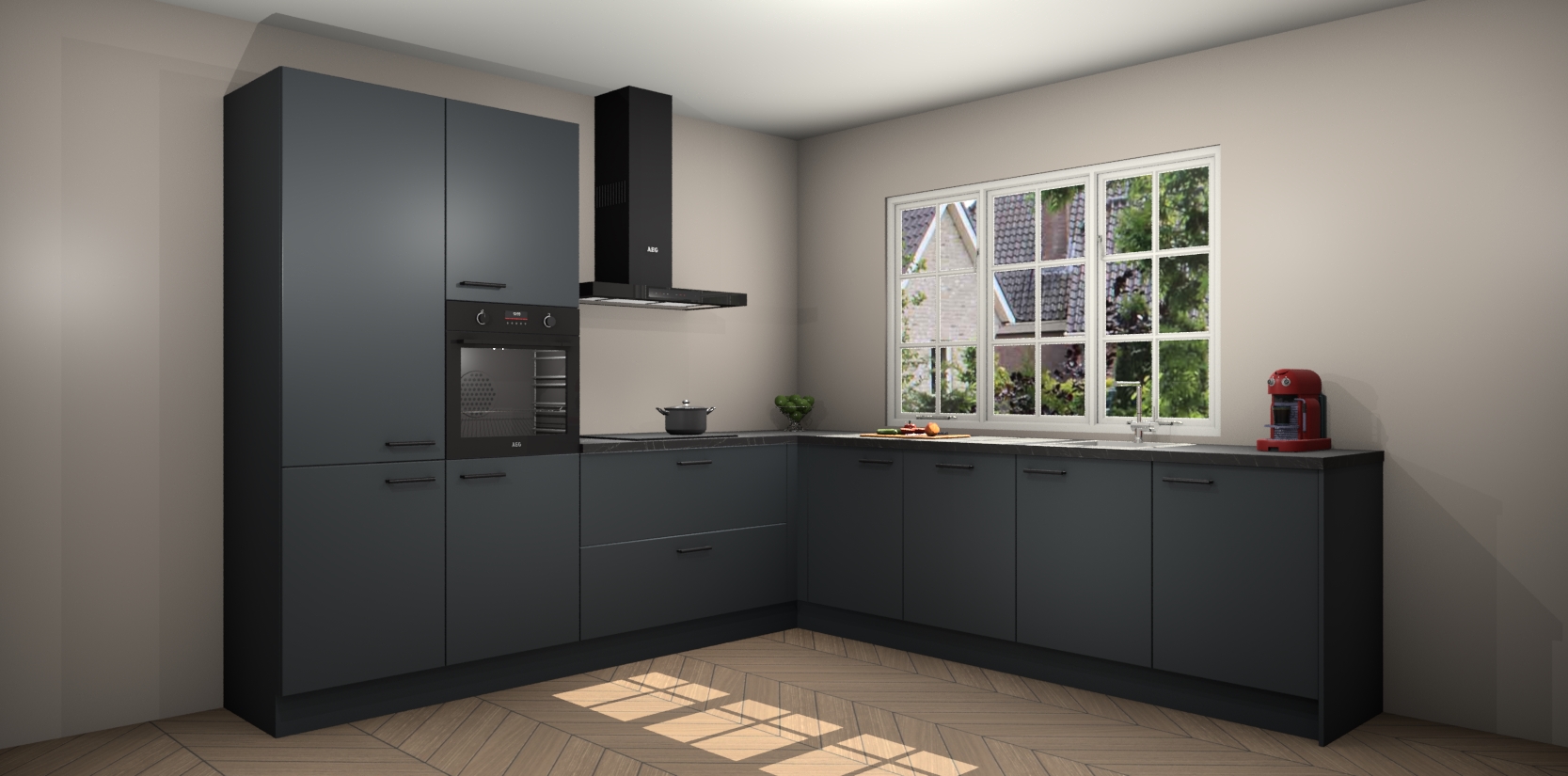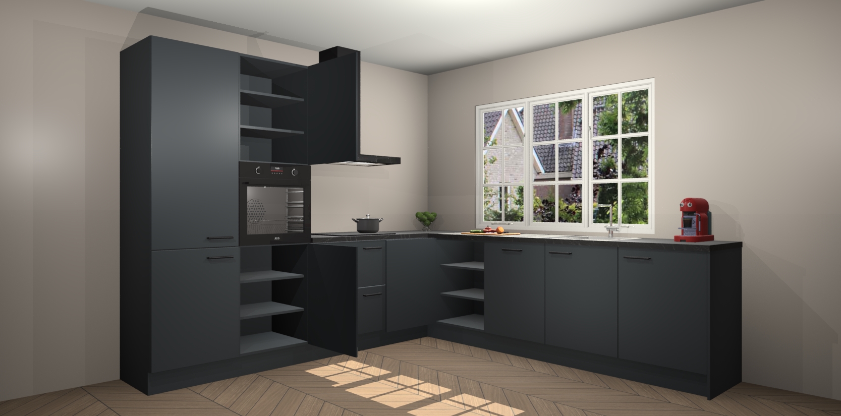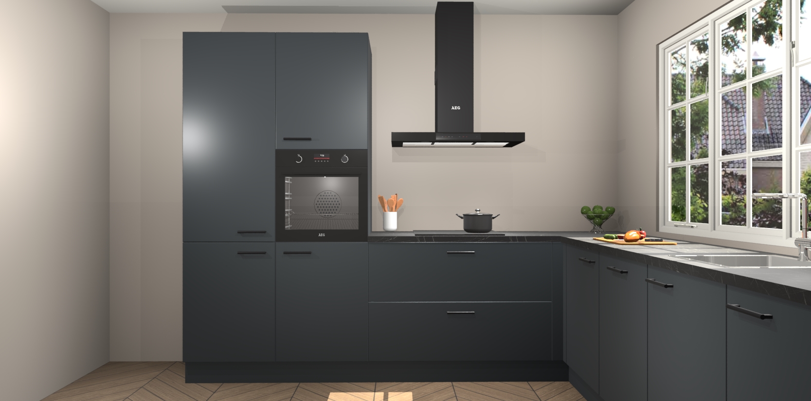 De keuken heeft veel opbergruimte, waardoor u alle ingrediënten gemakkelijk bereikbaar hebt staan. En daarnaast bevat deze volledig uitgeruste keuken ook 5 ingebouwde apparaten: een oven, inductiekookplaat, afzuigkap, vaatwasser en koelkast. Deze zijn heel eenvoudig na bestellen te upgraden naar AEG als u dit wilt. Bovendien zijn de softclose-kastdeuren ideaal; geef ze gewoon even een tikje en ze sluiten automatisch met geruisloze precisie.
