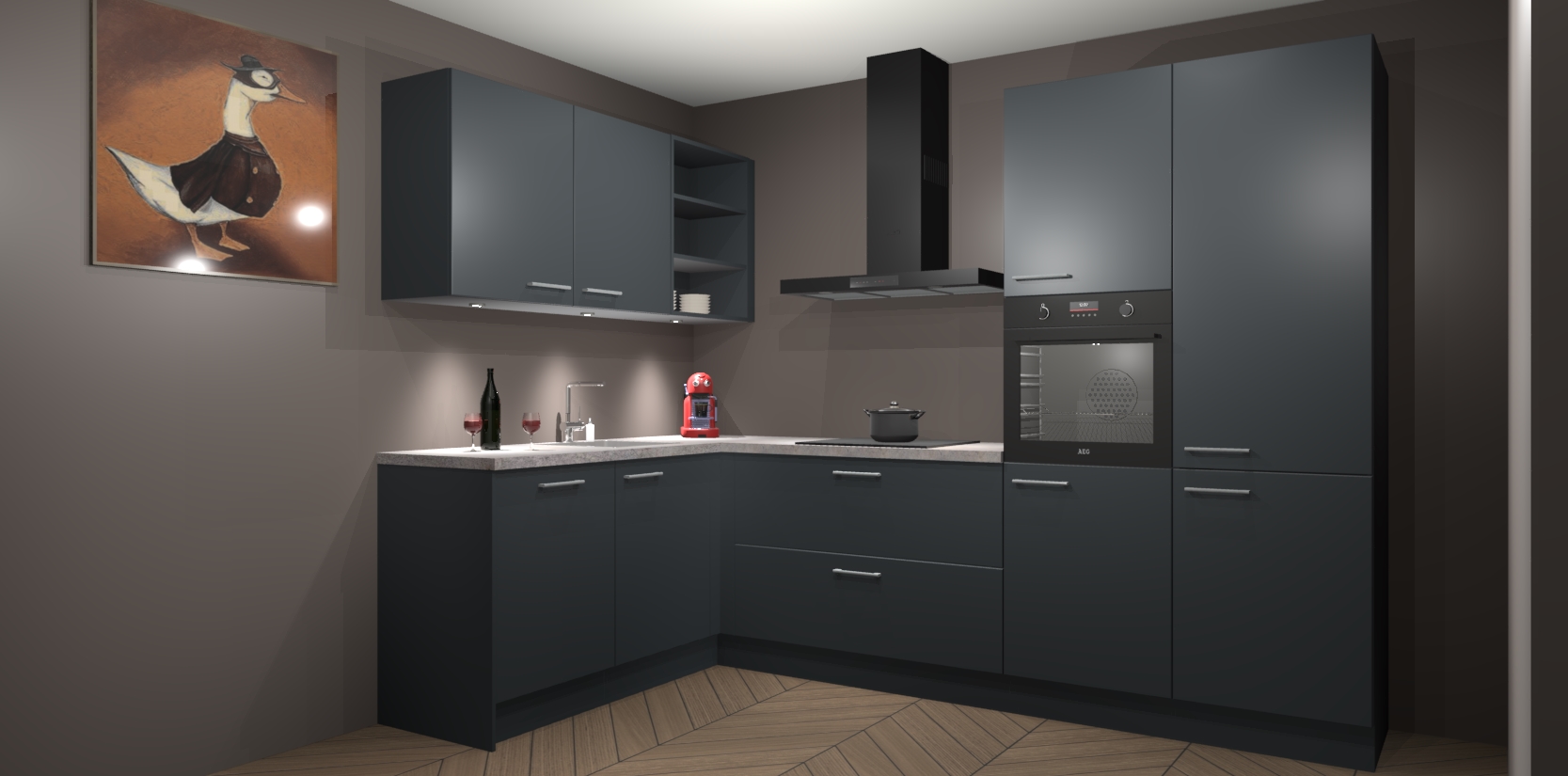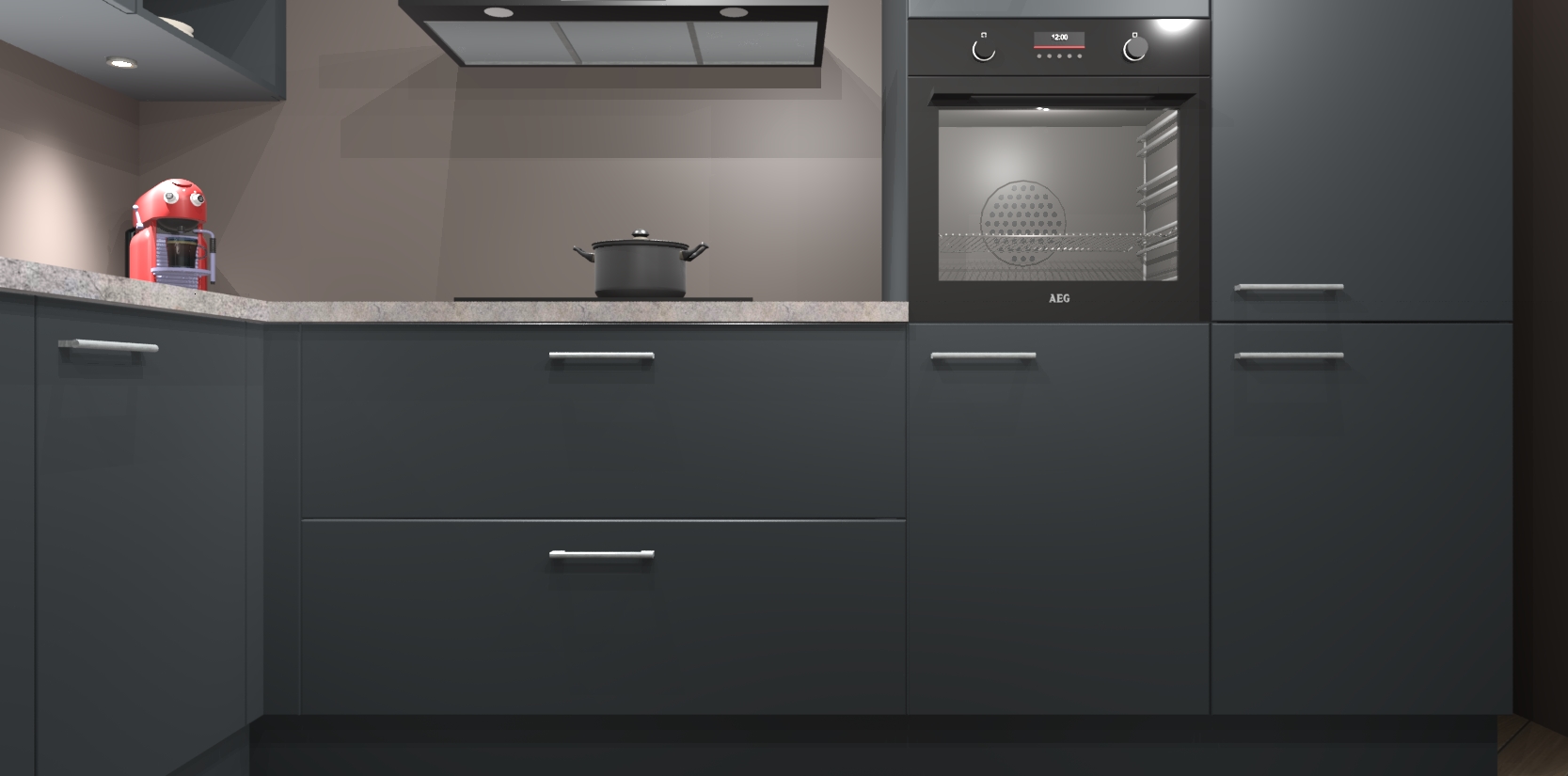 De Onyxgrijze keuken Cognac is een adembenemend ontwerp met een modern en tijdloos uiterlijk. Deze luxe keuken straalt echt aristocratisch uit, waardoor uw koken plezieriger zal worden! Het prachtige design begint bij de hoekkeuken, wat perfect past bij elk type interieur. Bovendien bevat deze hoogwaardige set vijf inbouwapparaten - van oven tot koelkast - die via bestelling naar AEG geüpgraded kunnen worden!