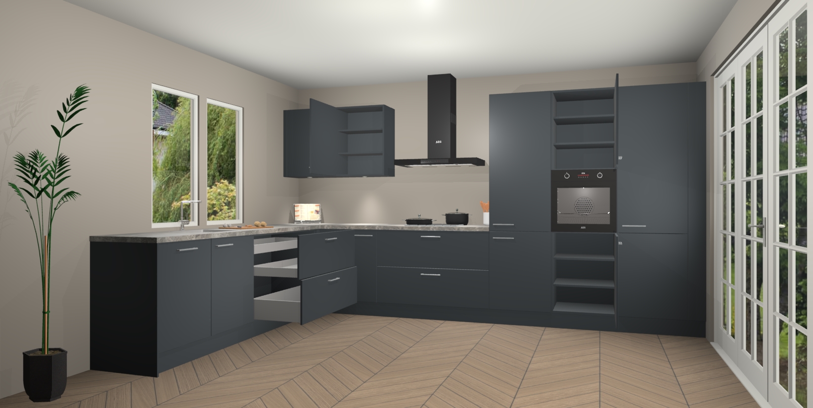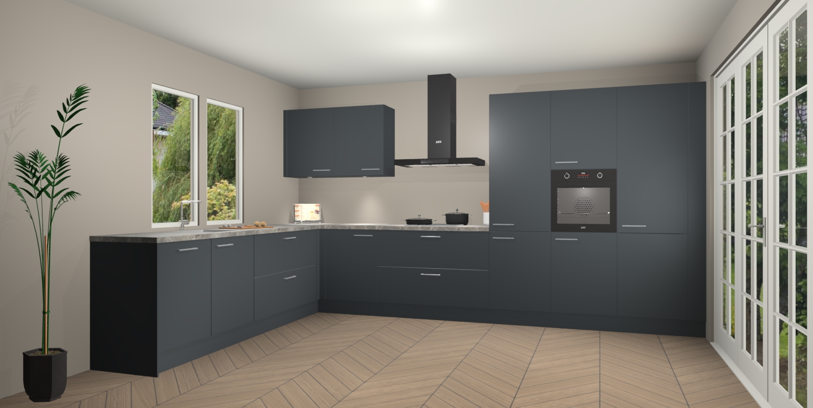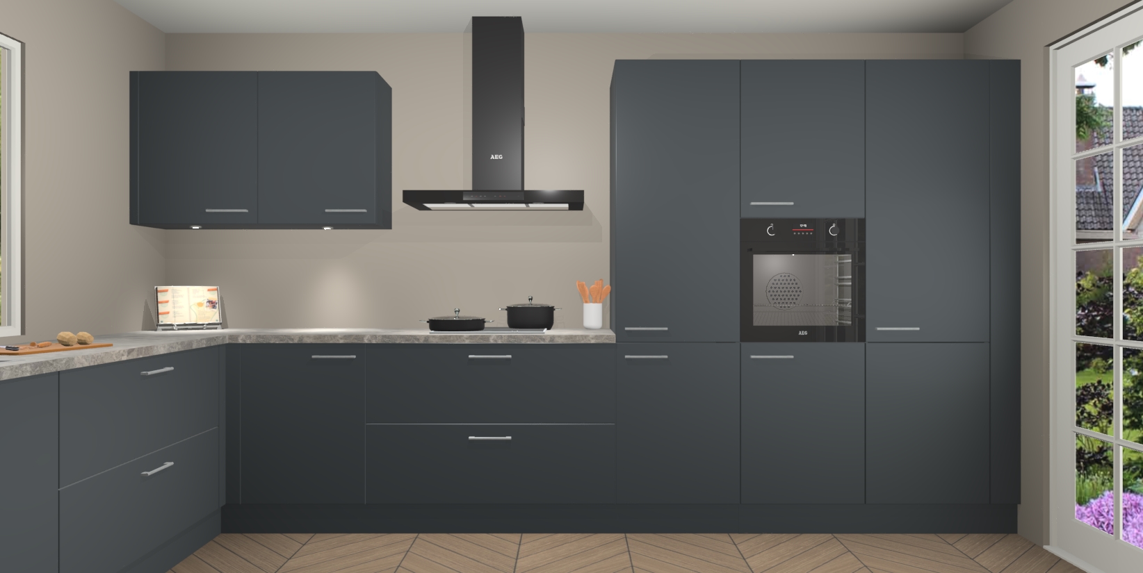 Heeft u nog apparatuur nodig? Geen probleem: de Onyxgrijze keuken Debrecen bevat vijf ingebouwde apparaten - een oven, inductiekookplaat, afzuigkap, vaatwasser en koelkast - die gemakkelijk kunnen worden bijgewerkt naar AEG na bestelling. En als dat nog niet genoeg is; onze kasten worden pre-geassembleerd geleverd en zijn verkrijgbaar tegen een vastgeroeste lage prijs! U hoeft nooit meer te zoeken naar goede kwaliteit en service want onze producten hebben echt Duitse kwaliteit.