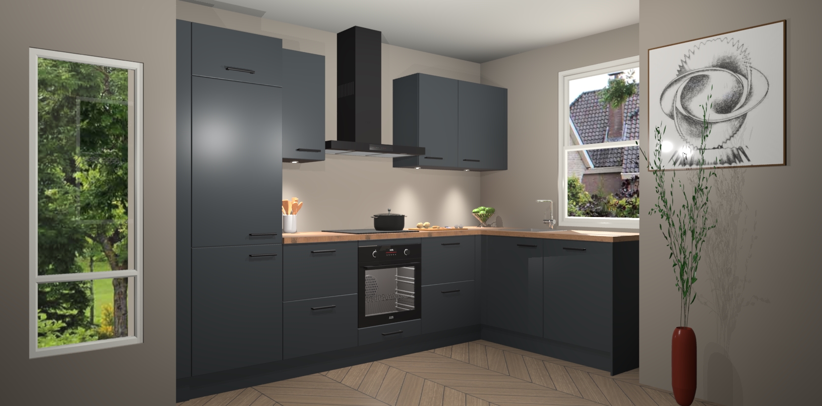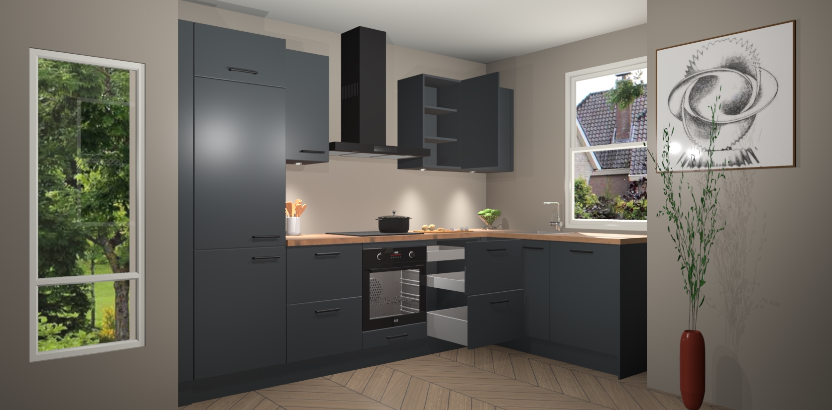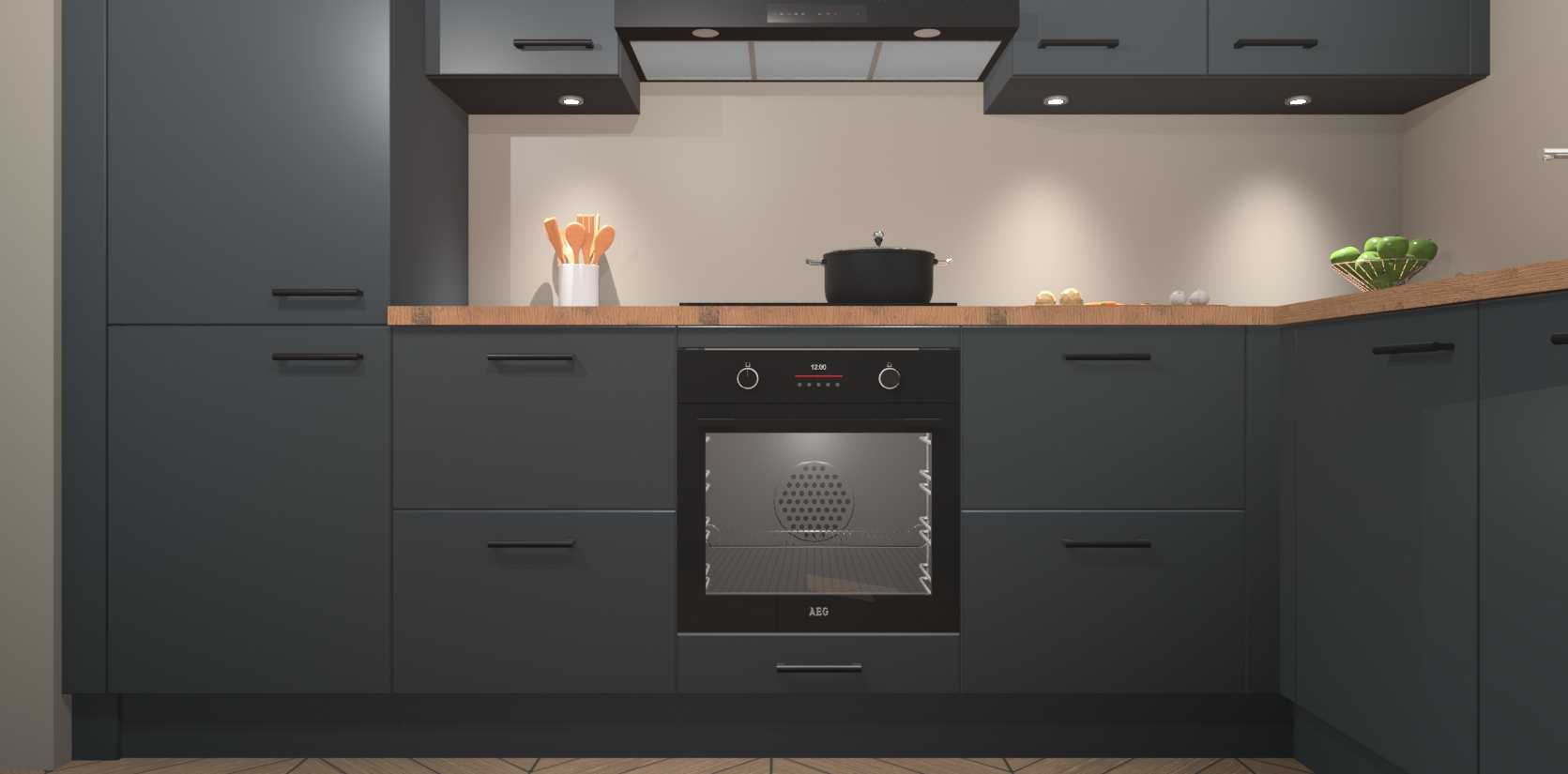 De onyxgrijze keuken Geneve is uitgerust met 5 inbouwapparaten - een oven, inductiekookplaat, afzuigkap, vaatwasser en koelkast - voor al uw kook- en bewaarbehoeftes. U kunt deze apparaten desgewenst eenvoudig upgraden naar AEG of de oven omruilen voor een combimagnetron na het plaatsen van uw bestelling. En met de soft close deuren, voldoende opbergruimte en kasten die voorgemonteerd worden geleverd, bent u in een mum van tijd klaar om heerlijke maaltijden te bereiden!
