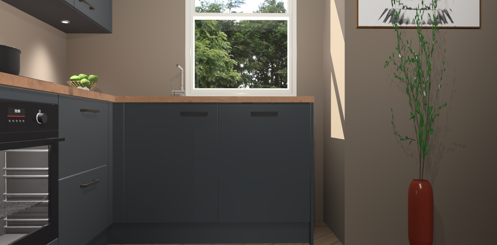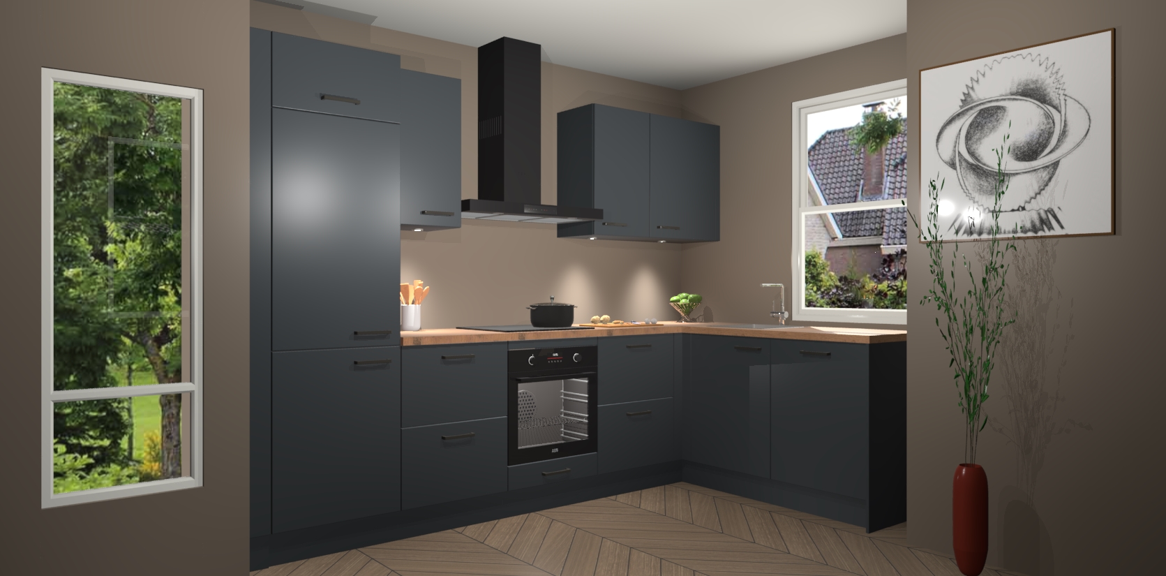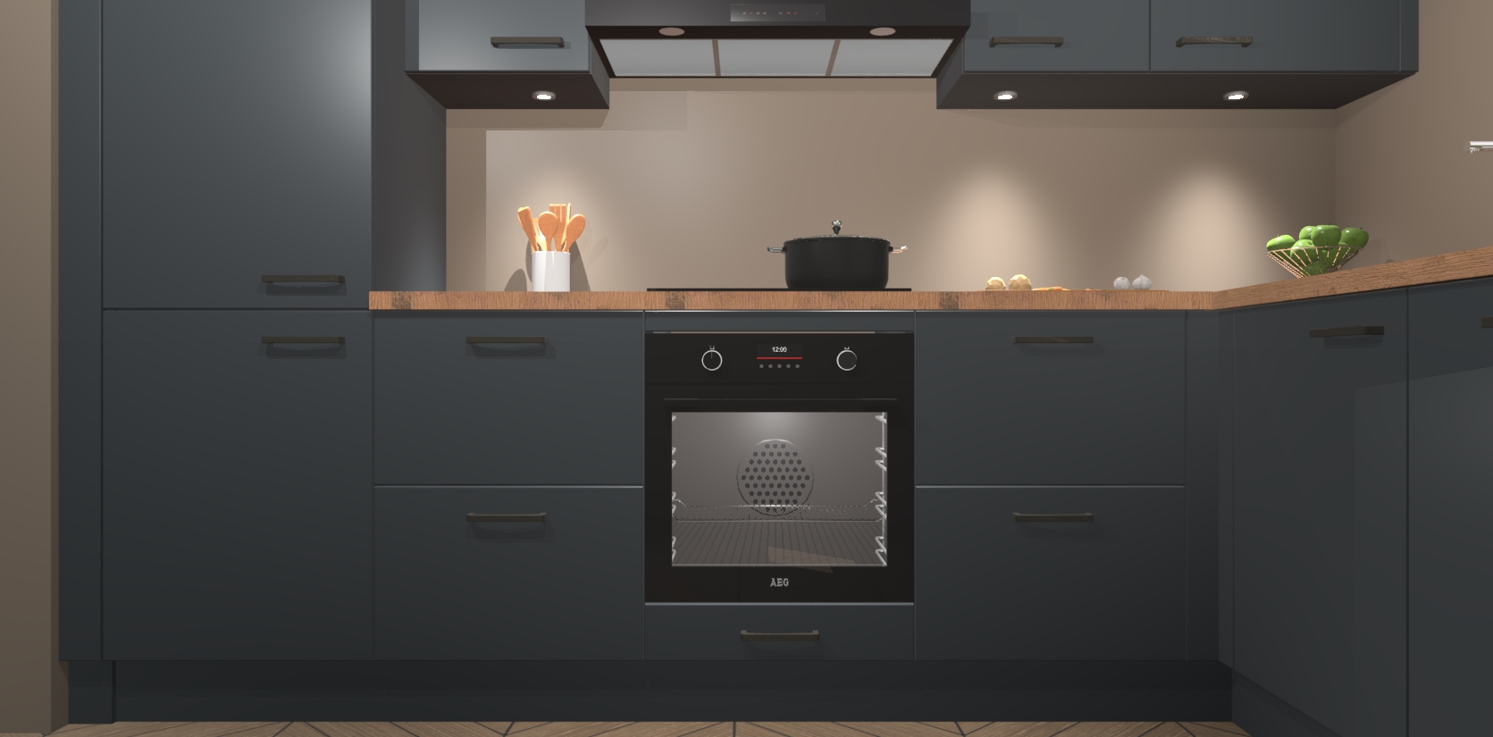 De onyxgrijze keuken Geneve is uitgerust met 5 inbouwapparaten - een oven, inductiekookplaat, afzuigkap, vaatwasser en koelkast - voor al uw kook- en bewaarbehoeftes. U kunt deze apparaten desgewenst eenvoudig upgraden naar AEG of de oven omruilen voor een combimagnetron na het plaatsen van uw bestelling. En met de soft close deuren, voldoende opbergruimte en kasten die voorgemonteerd worden geleverd, bent u in een mum van tijd klaar om heerlijke maaltijden te bereiden!