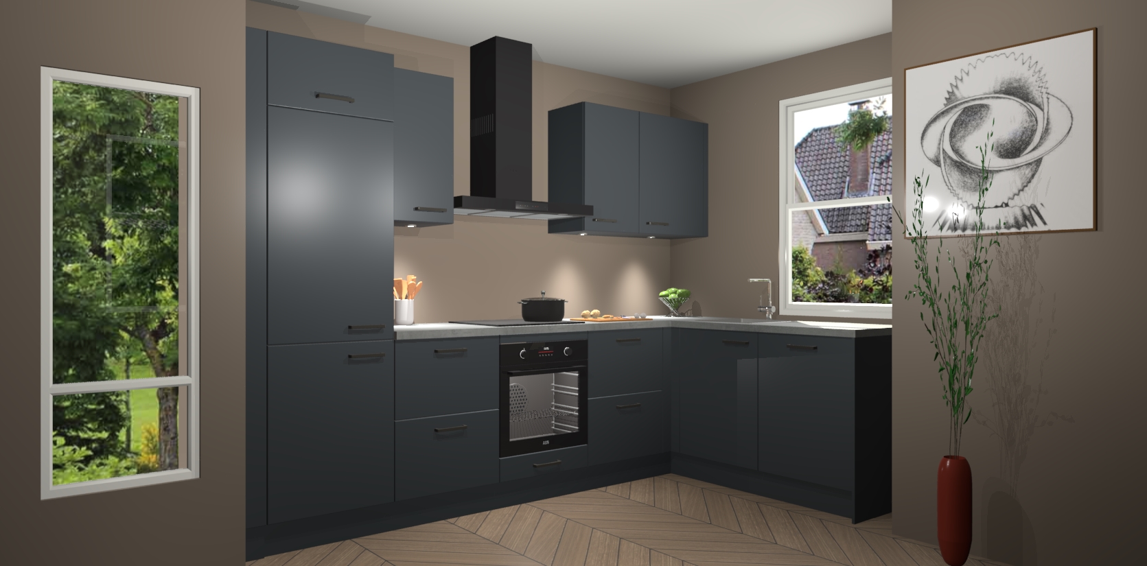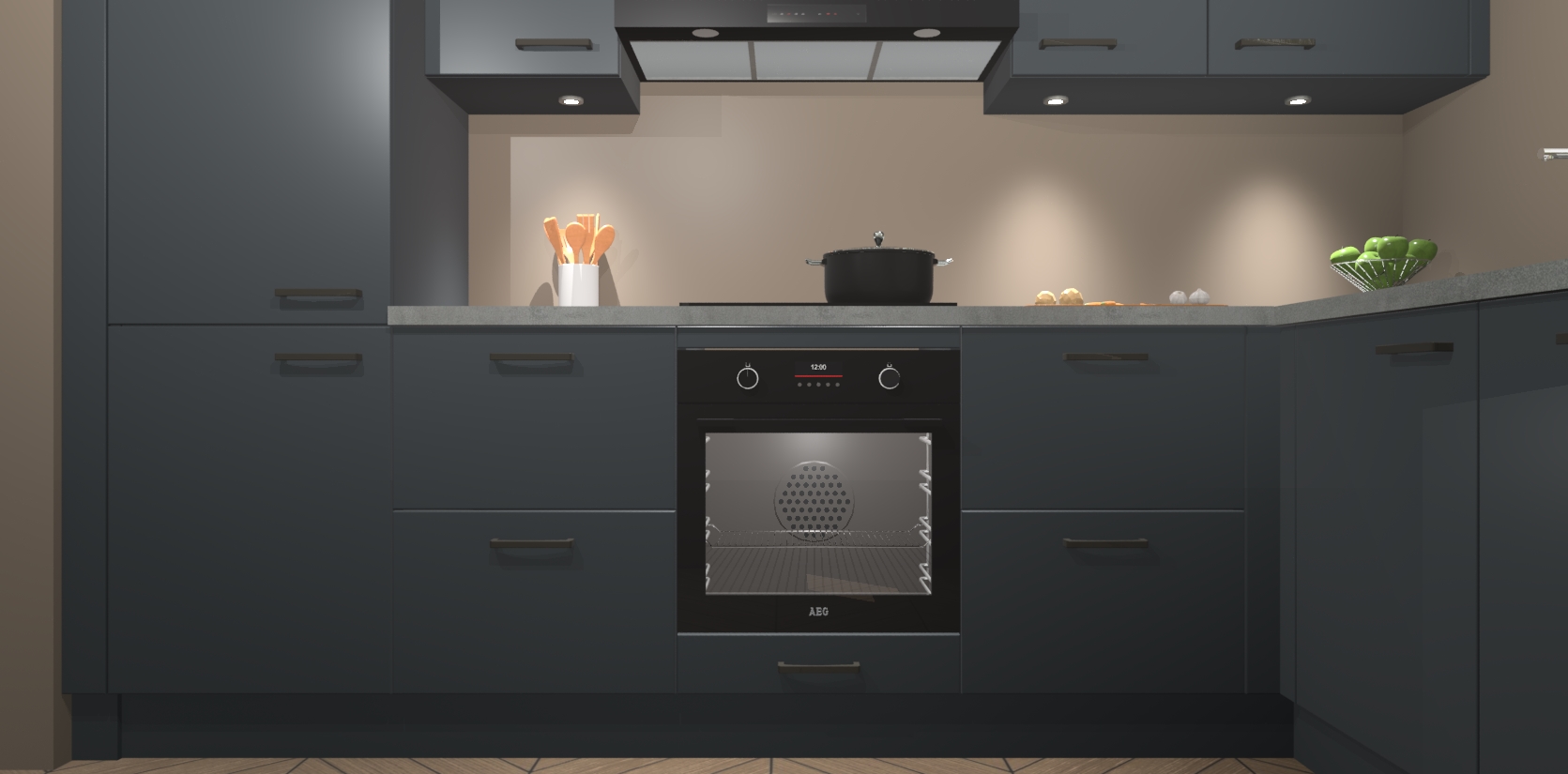 De onyxgrijze keuken Geneve is uitgerust met 5 inbouwapparaten - een oven, inductiekookplaat, afzuigkap, vaatwasser en koelkast - voor al uw kook- en bewaarbehoeftes. U kunt deze apparaten desgewenst eenvoudig upgraden naar AEG of de oven omruilen voor een combimagnetron na het plaatsen van uw bestelling. En met de soft close deuren, voldoende opbergruimte en kasten die voorgemonteerd worden geleverd, bent u in een mum van tijd klaar om heerlijke maaltijden te bereiden!