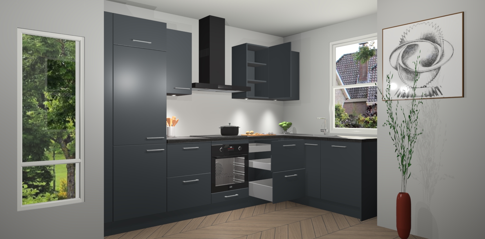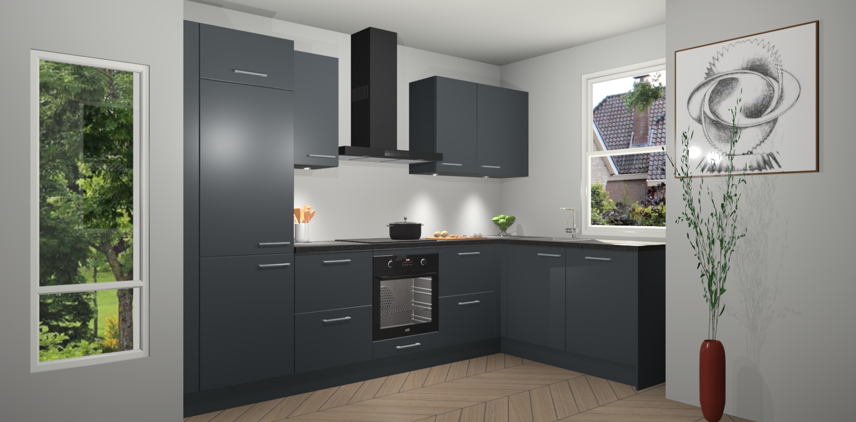Bent u op zoek naar een moderne en tijdloze keuken die schoonheid in uw huis brengt? Zoek dan niet verder dan de onyxgrijze keuken Geneve - de perfecte keuken voor al uw wensen. Deze hoekkeuken biedt de hoogste Duitse kwaliteit voor een vaste lage prijs en is zeker een blikvanger in uw huis!
