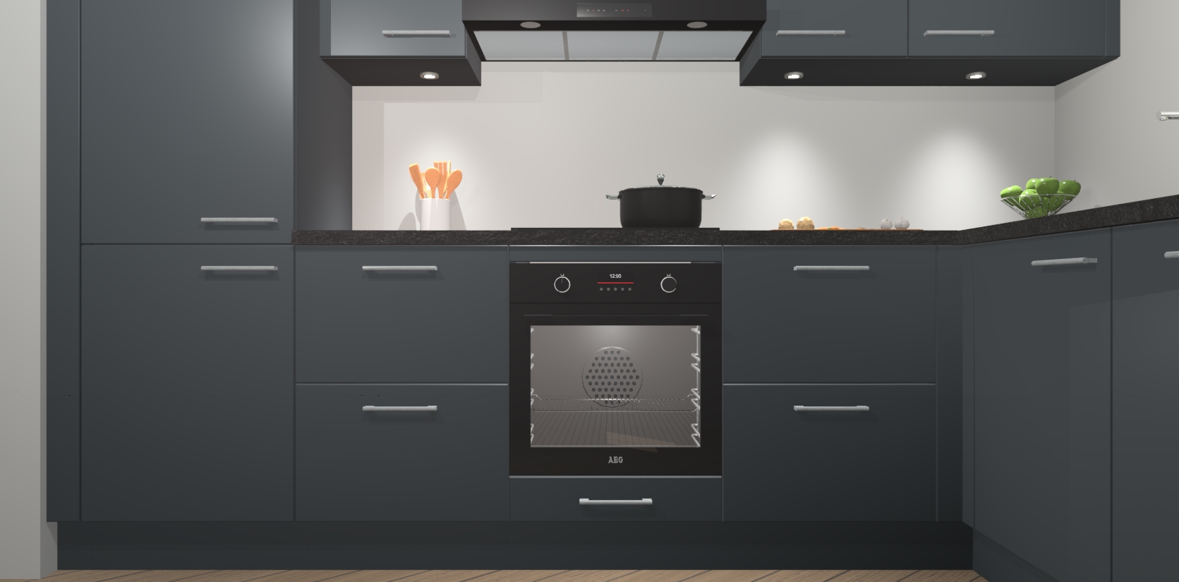 De onyxgrijze keuken Geneve is uitgerust met 5 inbouwapparaten - een oven, inductiekookplaat, afzuigkap, vaatwasser en koelkast - voor al uw kook- en bewaarbehoeftes. U kunt deze apparaten desgewenst eenvoudig upgraden naar AEG of de oven omruilen voor een combimagnetron na het plaatsen van uw bestelling. En met de soft close deuren, voldoende opbergruimte en kasten die voorgemonteerd worden geleverd, bent u in een mum van tijd klaar om heerlijke maaltijden te bereiden!