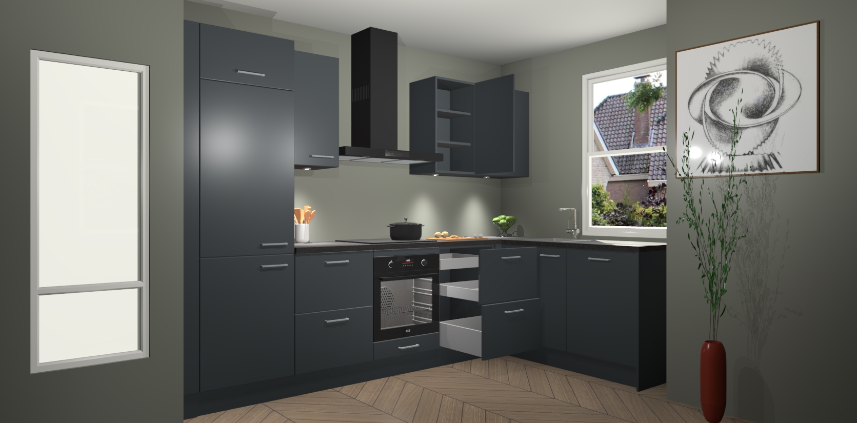 De onyxgrijze keuken Geneve is uitgerust met 5 inbouwapparaten - een oven, inductiekookplaat, afzuigkap, vaatwasser en koelkast - voor al uw kook- en bewaarbehoeftes. U kunt deze apparaten desgewenst eenvoudig upgraden naar AEG of de oven omruilen voor een combimagnetron na het plaatsen van uw bestelling. En met de soft close deuren, voldoende opbergruimte en kasten die voorgemonteerd worden geleverd, bent u in een mum van tijd klaar om heerlijke maaltijden te bereiden!