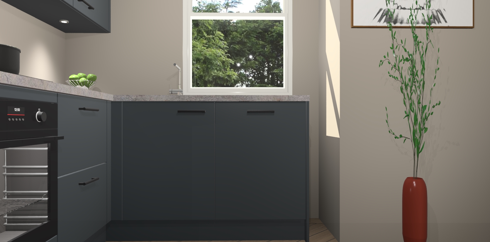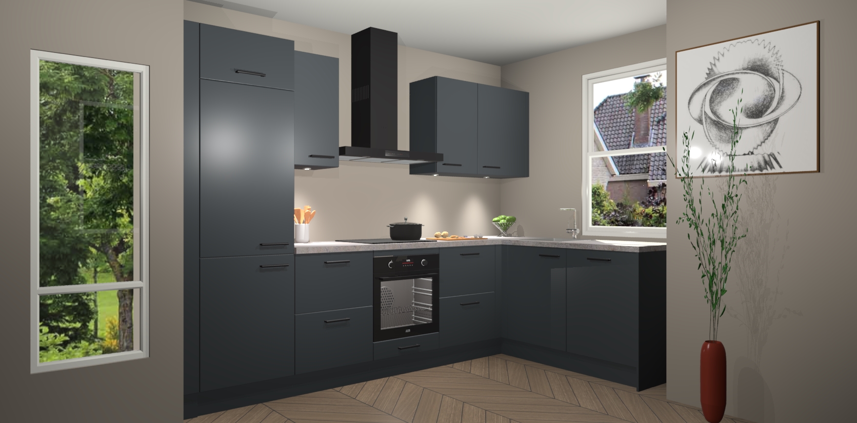 De onyxgrijze keuken Geneve is uitgerust met 5 inbouwapparaten - een oven, inductiekookplaat, afzuigkap, vaatwasser en koelkast - voor al uw kook- en bewaarbehoeftes. U kunt deze apparaten desgewenst eenvoudig upgraden naar AEG of de oven omruilen voor een combimagnetron na het plaatsen van uw bestelling. En met de soft close deuren, voldoende opbergruimte en kasten die voorgemonteerd worden geleverd, bent u in een mum van tijd klaar om heerlijke maaltijden te bereiden!