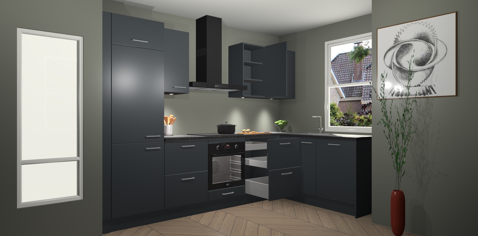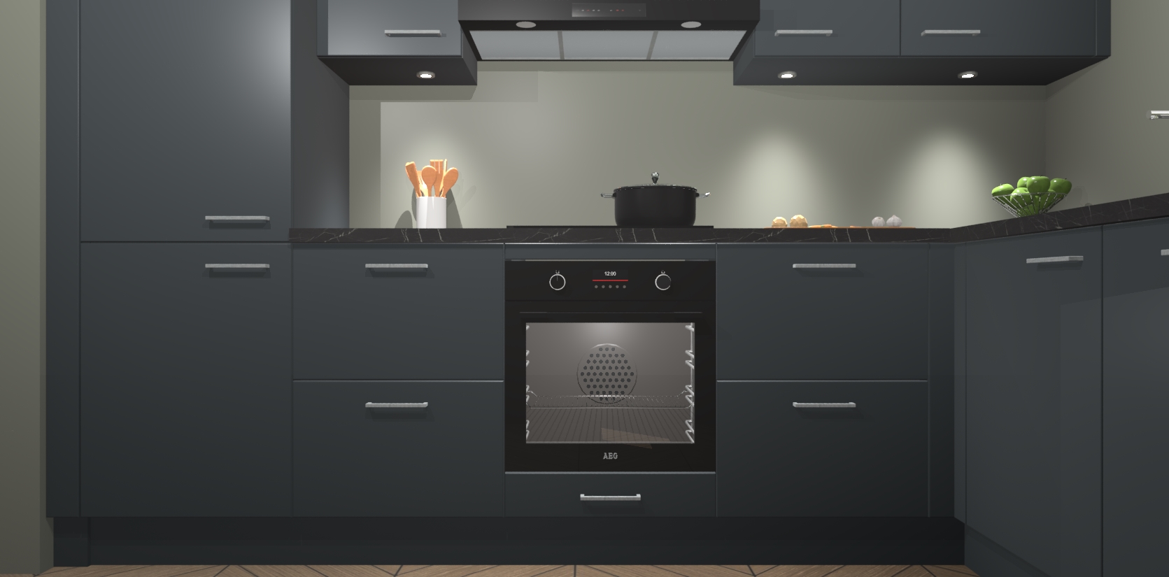 De onyxgrijze keuken Geneve is uitgerust met 5 inbouwapparaten - een oven, inductiekookplaat, afzuigkap, vaatwasser en koelkast - voor al uw kook- en bewaarbehoeftes. U kunt deze apparaten desgewenst eenvoudig upgraden naar AEG of de oven omruilen voor een combimagnetron na het plaatsen van uw bestelling. En met de soft close deuren, voldoende opbergruimte en kasten die voorgemonteerd worden geleverd, bent u in een mum van tijd klaar om heerlijke maaltijden te bereiden!
