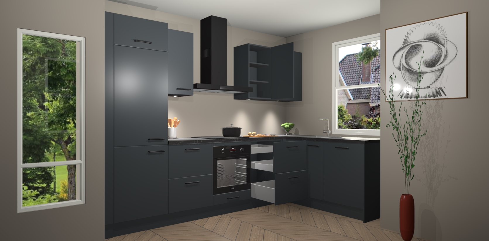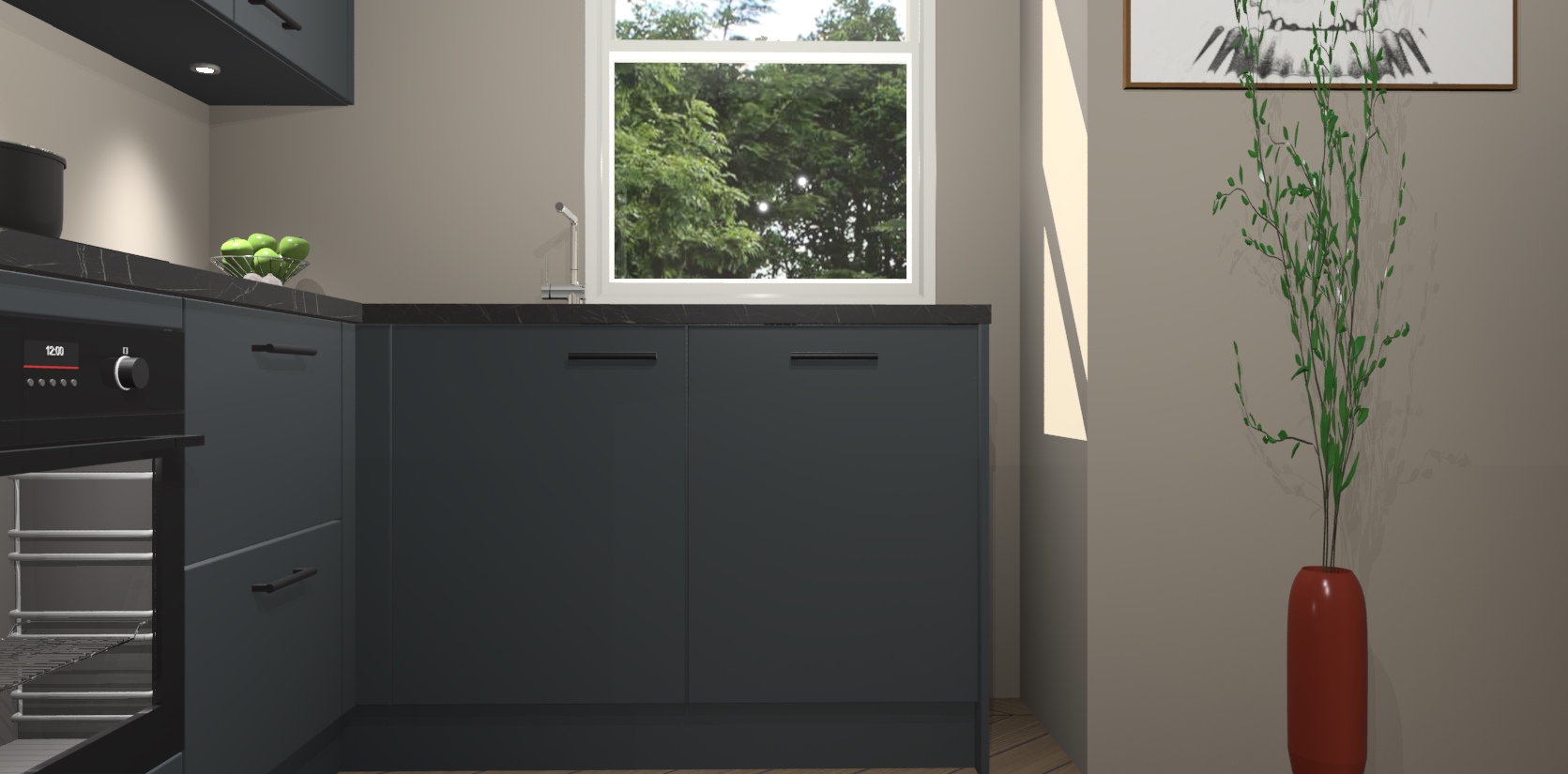 De onyxgrijze keuken Geneve is uitgerust met 5 inbouwapparaten - een oven, inductiekookplaat, afzuigkap, vaatwasser en koelkast - voor al uw kook- en bewaarbehoeftes. U kunt deze apparaten desgewenst eenvoudig upgraden naar AEG of de oven omruilen voor een combimagnetron na het plaatsen van uw bestelling. En met de soft close deuren, voldoende opbergruimte en kasten die voorgemonteerd worden geleverd, bent u in een mum van tijd klaar om heerlijke maaltijden te bereiden!