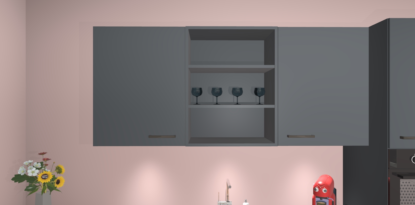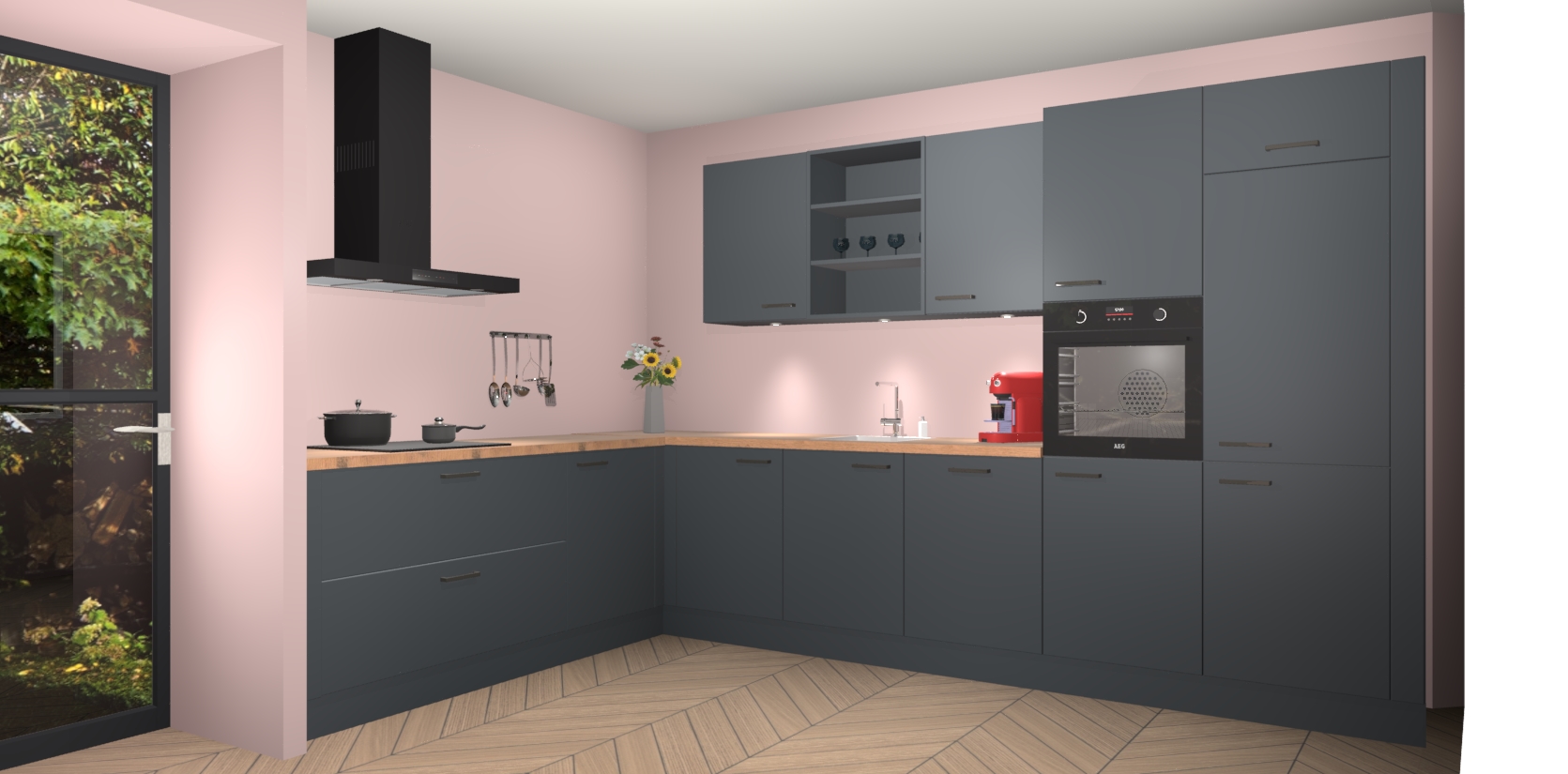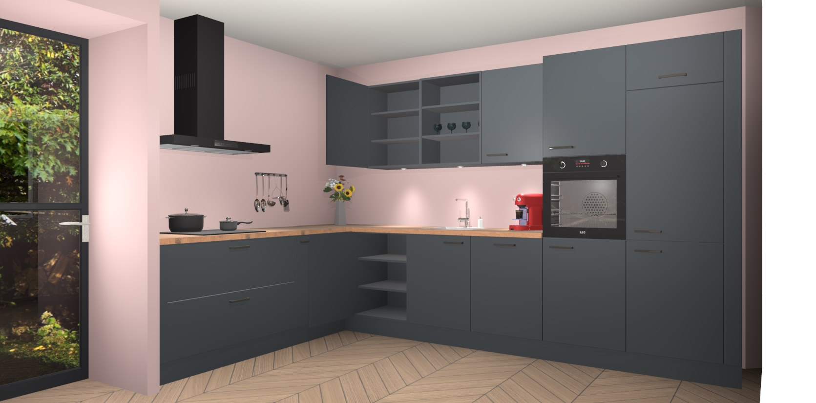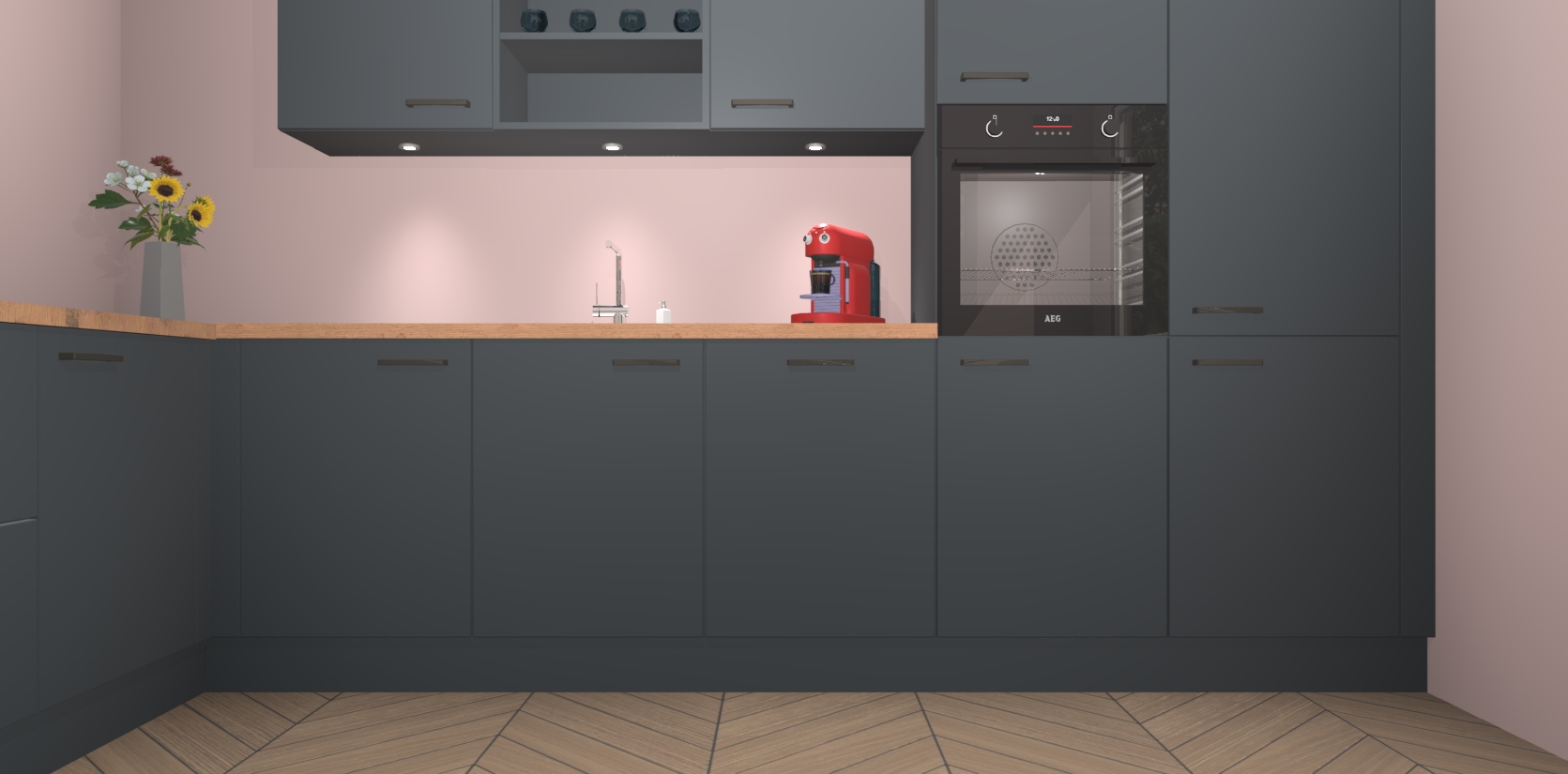 Over opbergruimte hoeft u zich ook geen zorgen te maken! Er is voldoende ruimte voor al uw culinaire behoeftes. Plus, we hebben al 5 inbouwapparaten meegeleverd die gemakkelijk na uw bestelling te upgraden zijn naar AEG: een oven, inductiekookplaat, afzuigkap, vaatwasser en koelkast. En maakt u zich geen zorgen - alle deuren sluiten zacht, dus u hoeft zich geen zorgen te maken over dichtslaande deuren of lawaai terwijl u kookt.
